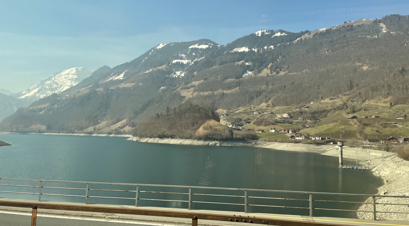 Wir müssen nicht anhalten, fahren ganz langsam durch die Station, fädeln uns ins Zahnrad ein, durchqueren einen kurzen Tunnel und haben dann einen schönen Blick auf den noch nicht vollen Lungernsee.
