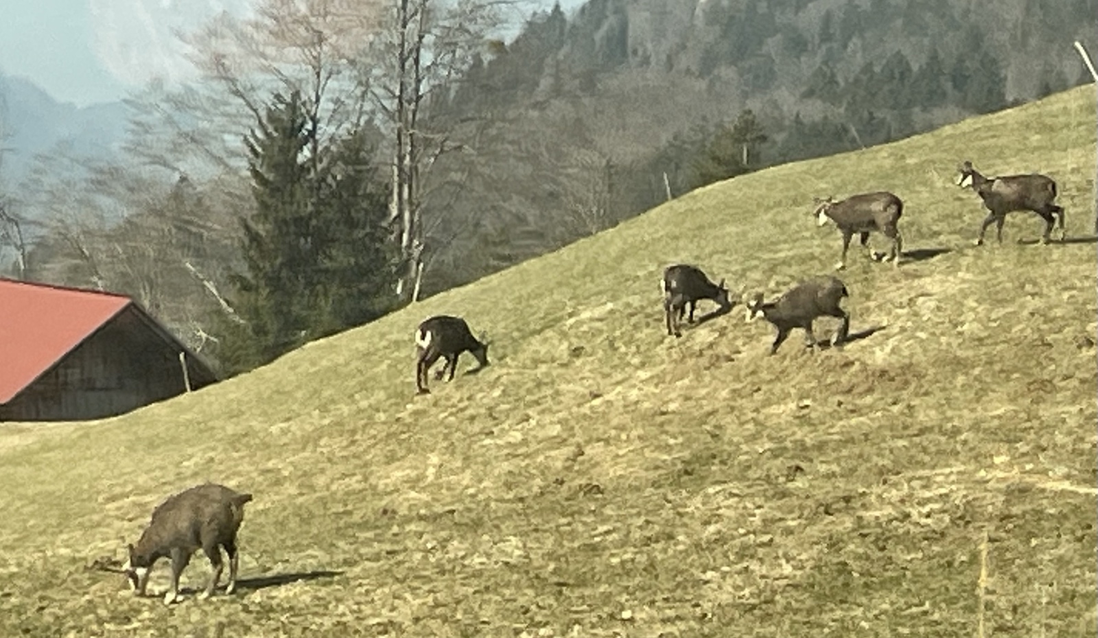 20 Minuten später sind wir schon im Anstieg zum Brünigpass auf 1002 Meter Scheitelhöhe. Ich möchte noch einen letzten Blick zum Brienzersee erhaschen, da erregt etwas anderes meine Aufmerksamkeit: weidende und keine 25 Meter neben der Bahnstrecke umher tollende Gämsen. Ist das ein Winteromen?