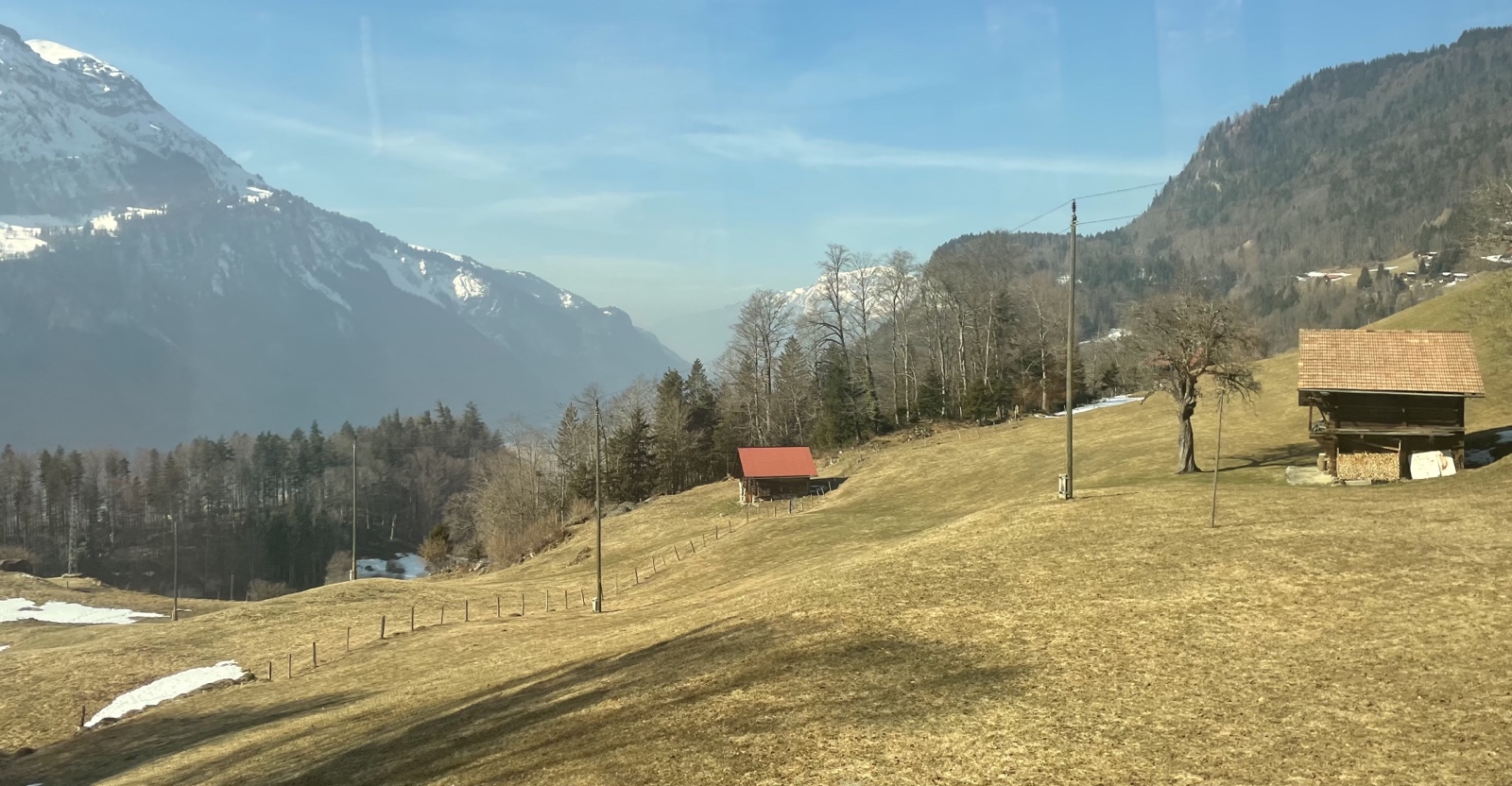 Nach dem Umsteigen in Landquart geniesse ich bald einmal einen letzten Ausblick durch den Dunst zu den Churfirsten.