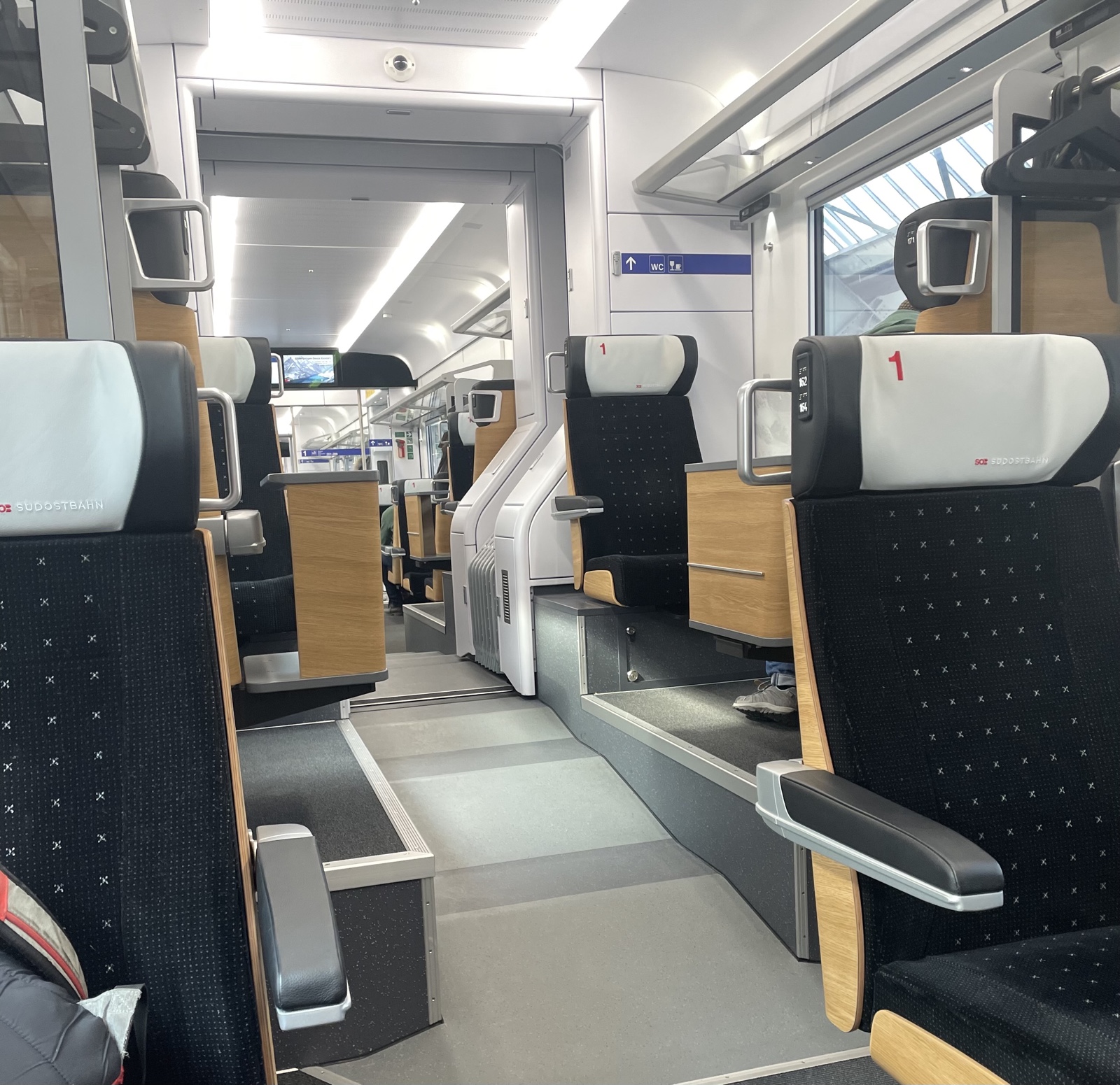 Ich habe mich noch immer nicht an die von der EU verlangten Rampen und Wagenübergänge gewöhnt. Also bleibe ich um nicht zu taumeln oder sogar zu stürzen im Niederflurbereich.