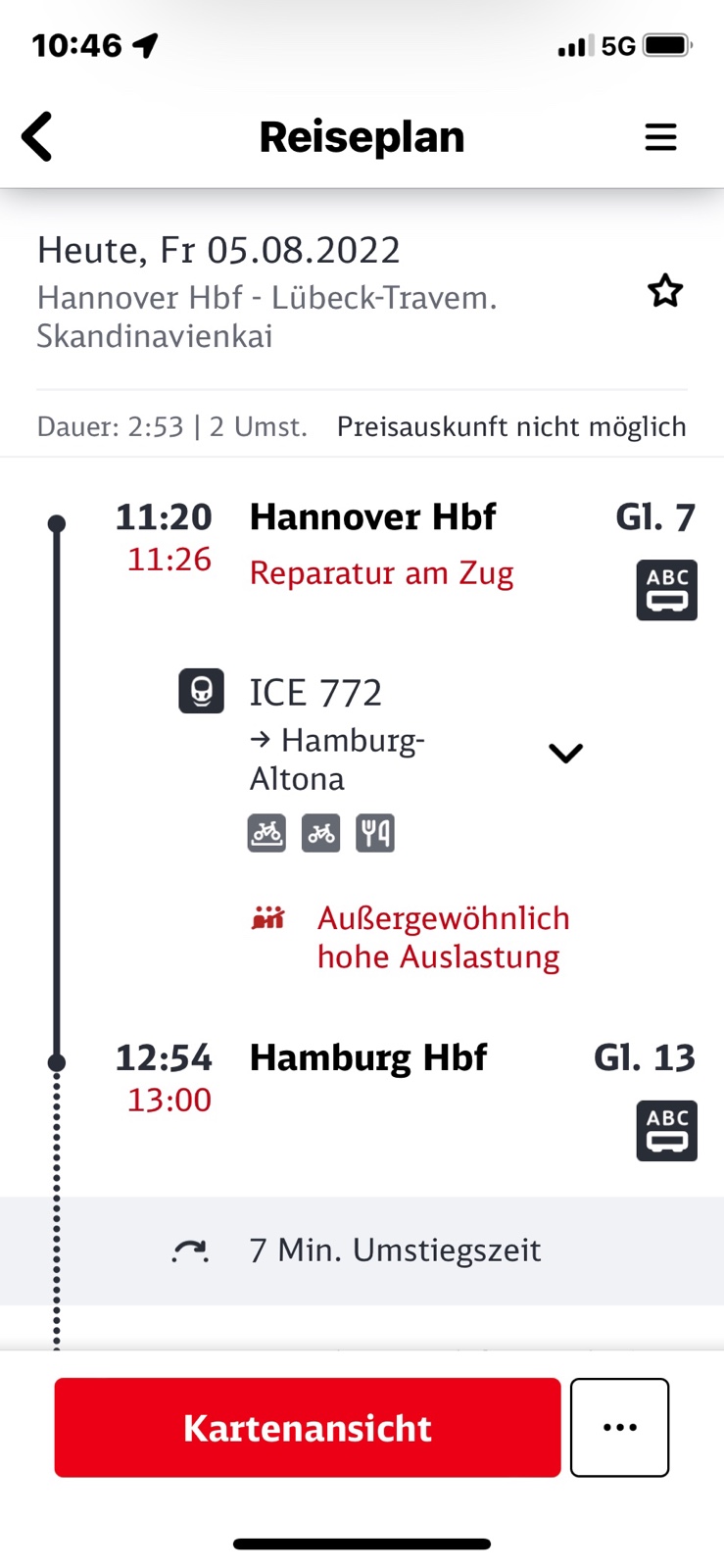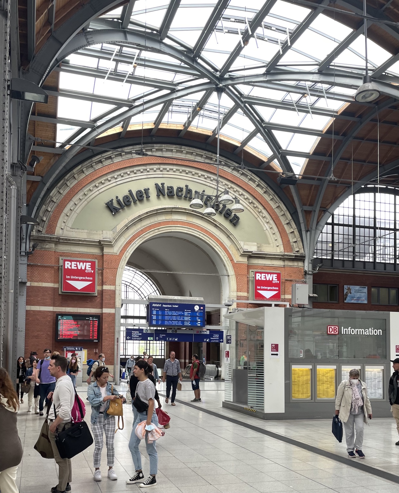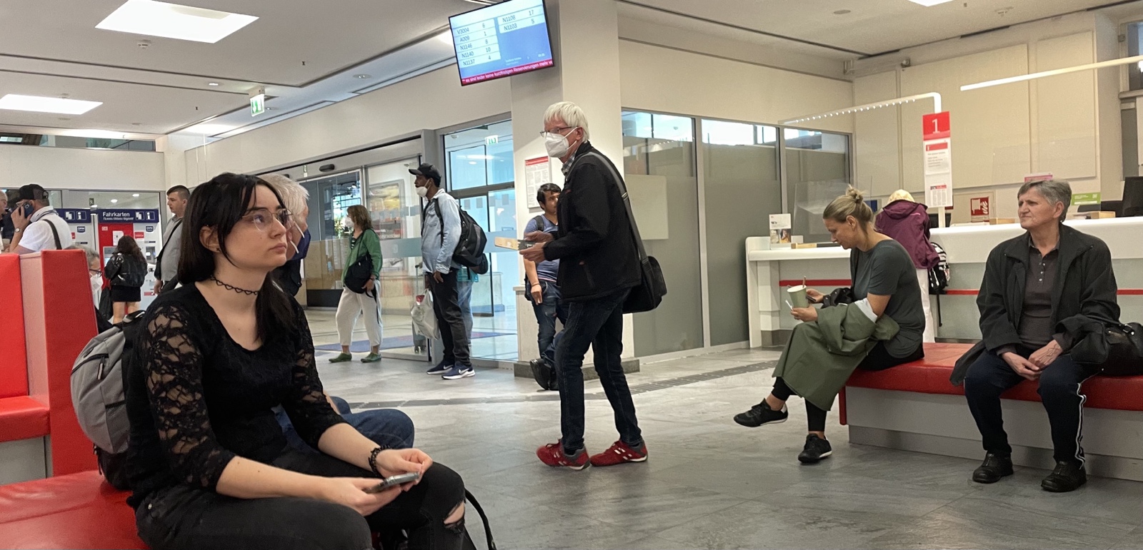 Im Reisezentrum stehen und sitzen die Leute dicht an dicht. 45 Minuten Wartezeit für ein Inlandbillett. Für ins Ausland muss ich nur 10 Minuten warten. Alle Züge Richtung Norden, nicht nur Kopenhagen auch Oslo und Stockholm sind für die kommenden Tage ausverkauft. Also fahre ich mal nach Hamburg.