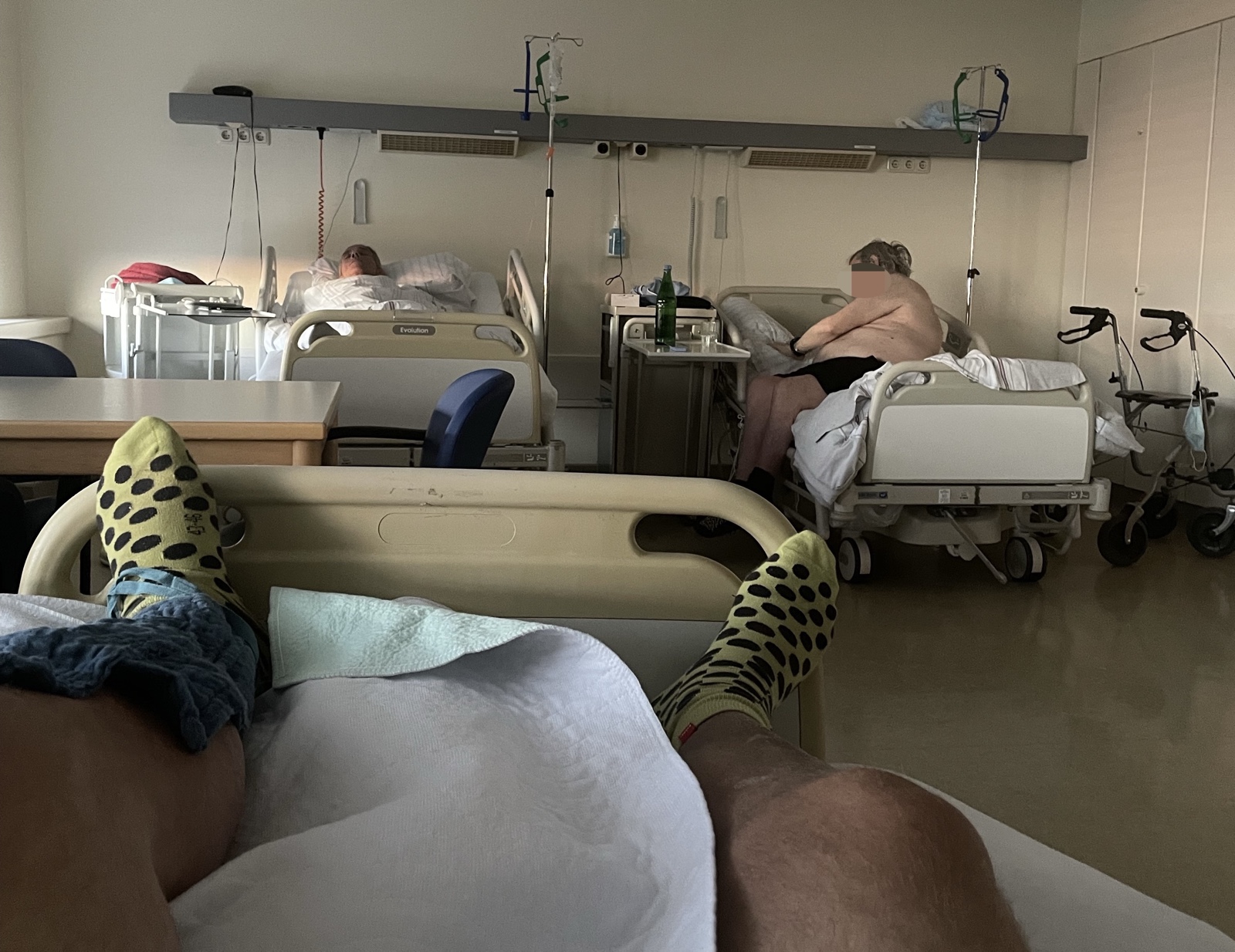 Dann aber dauerts, ich werde nicht verlegt. Schlussendlich, gegen 20 Uhr, schiebt die Stationschefin mich raus und bemerkt „ich will sie noch vor Ende meiner Schicht an ihrem Bestimmungsort wissen, ich will sie nicht an meine Nachfolgerin übergeben“. Bald sind wir im obersten, 5. Stock und landen in einem 4-Bettzimmer. Nur ein weiterer Mann ist drin. Naja, besser als nichts, Einzelzimmer gibt es nicht!