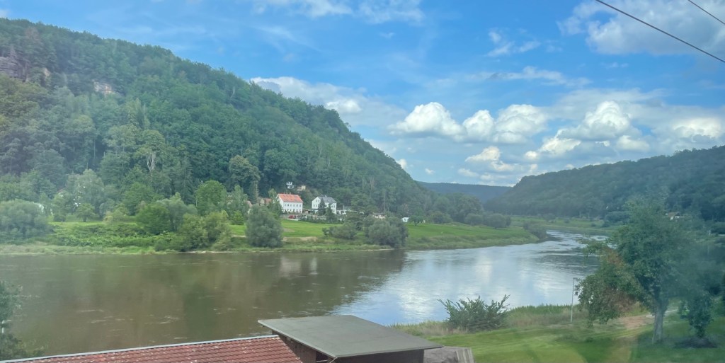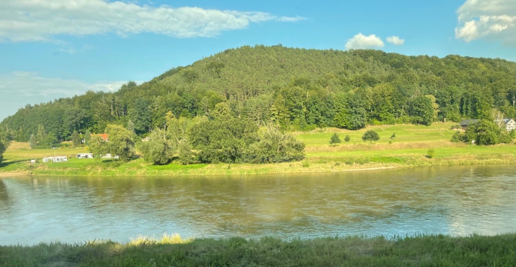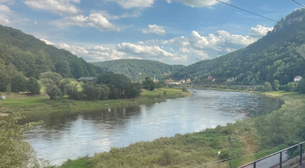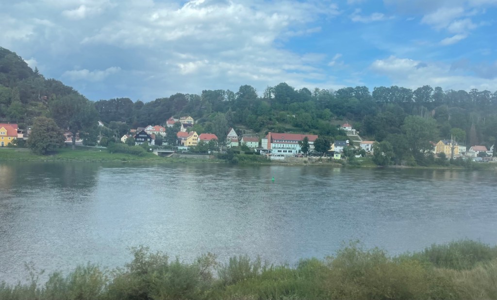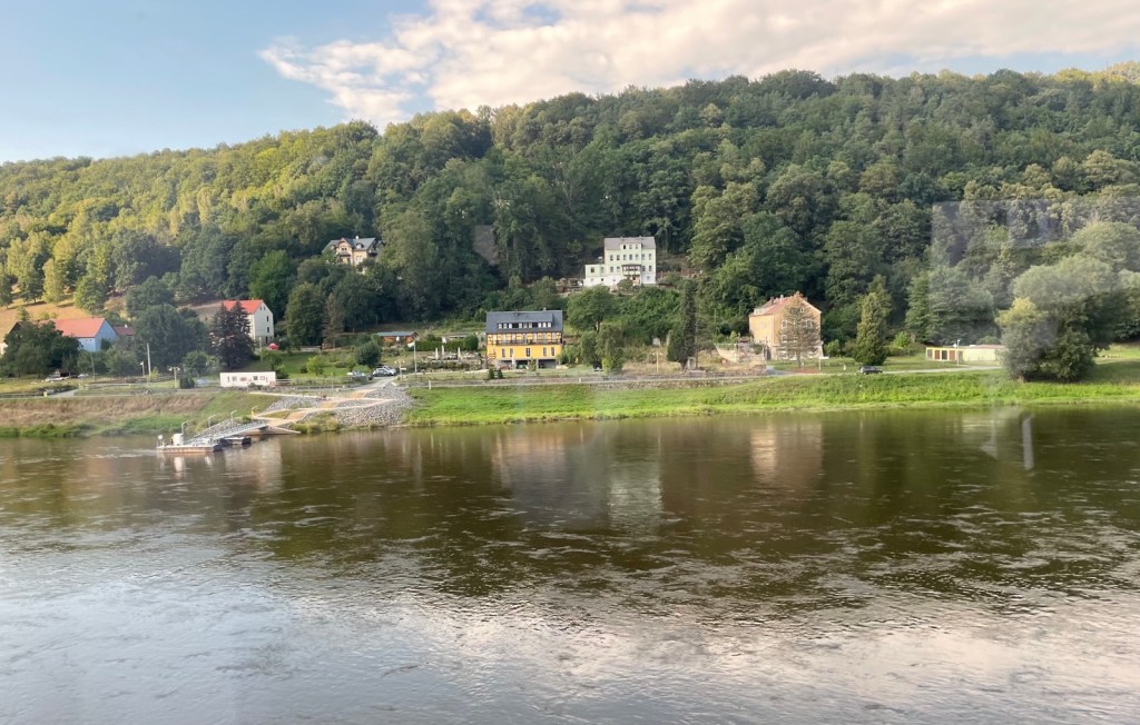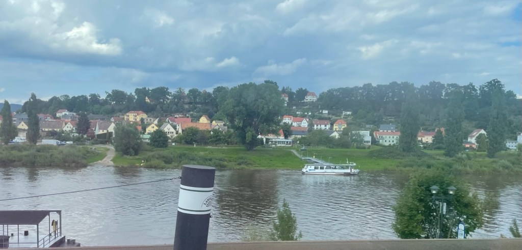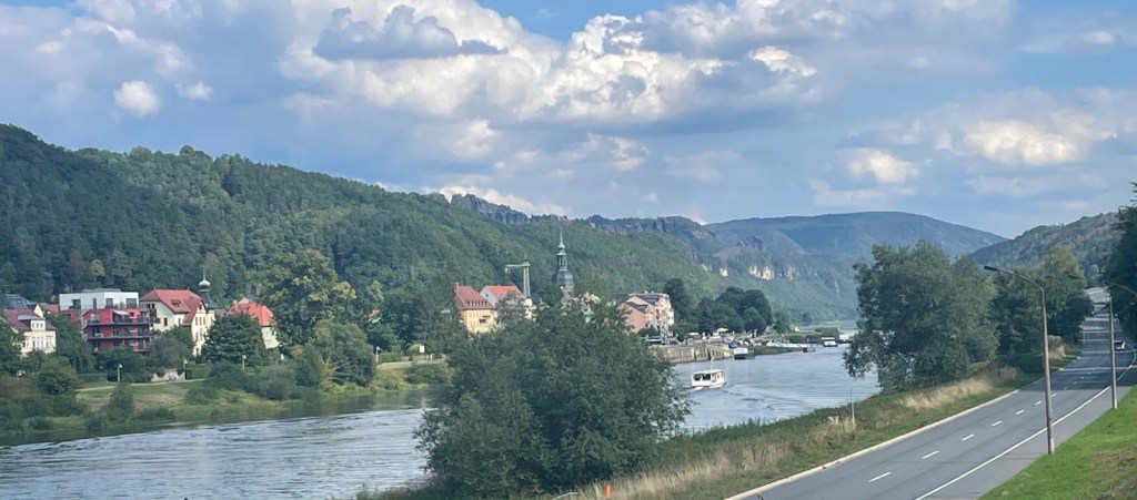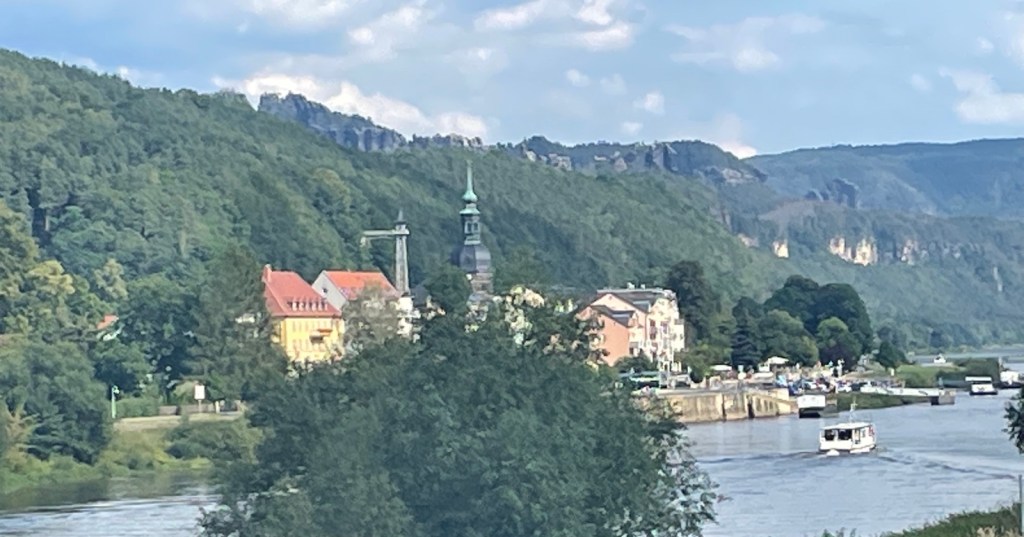Zwischen Bahnhof und Stadt Bad Schandau verkehren regelmässig Fähren. Diese sind aber so voll, dass mir eine Mitfahrt eher Last denn Lust bedeuten würde. Von Waldbränden keine Spur, auch wenn ein feiner Duft verbrannten Holzes in der Luft liegt.