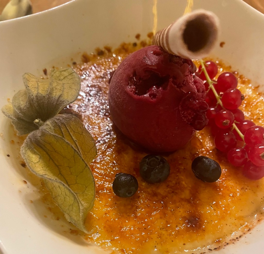 Nach dem stillen des grossen Durst esse ich ein deftiges Rossgulasch mit Spätzli. Zum Abrunden dieses Abendmahls geniesse ich eine Crème brûlée, garniert mit allerlei Früchten.