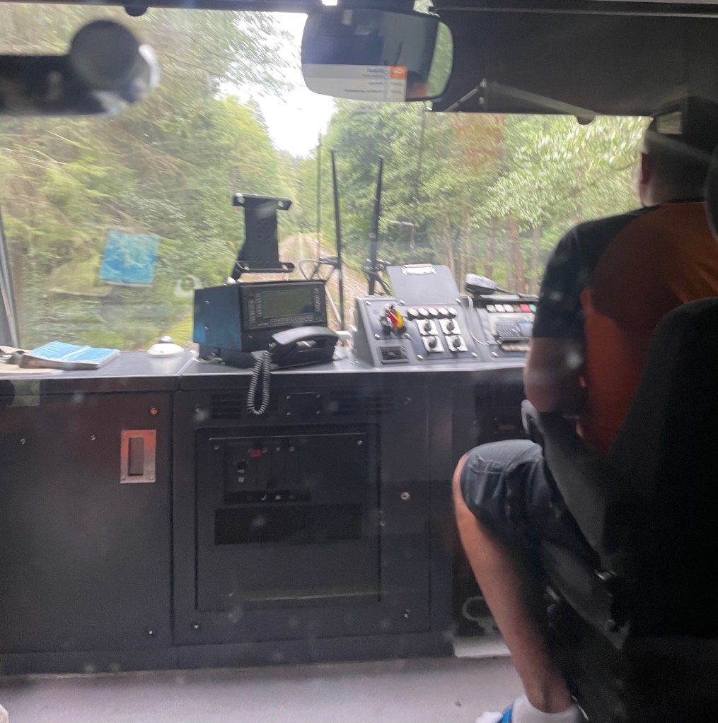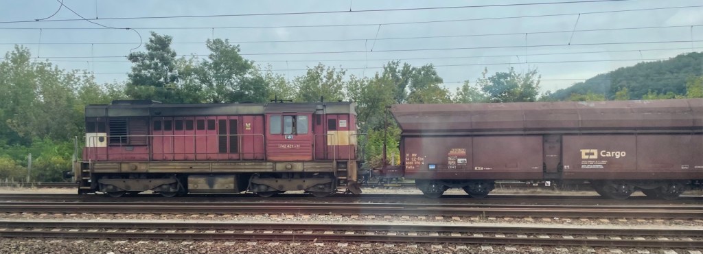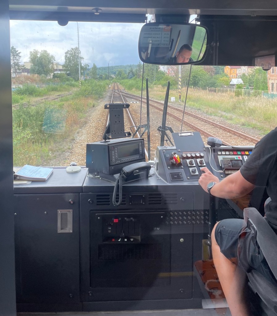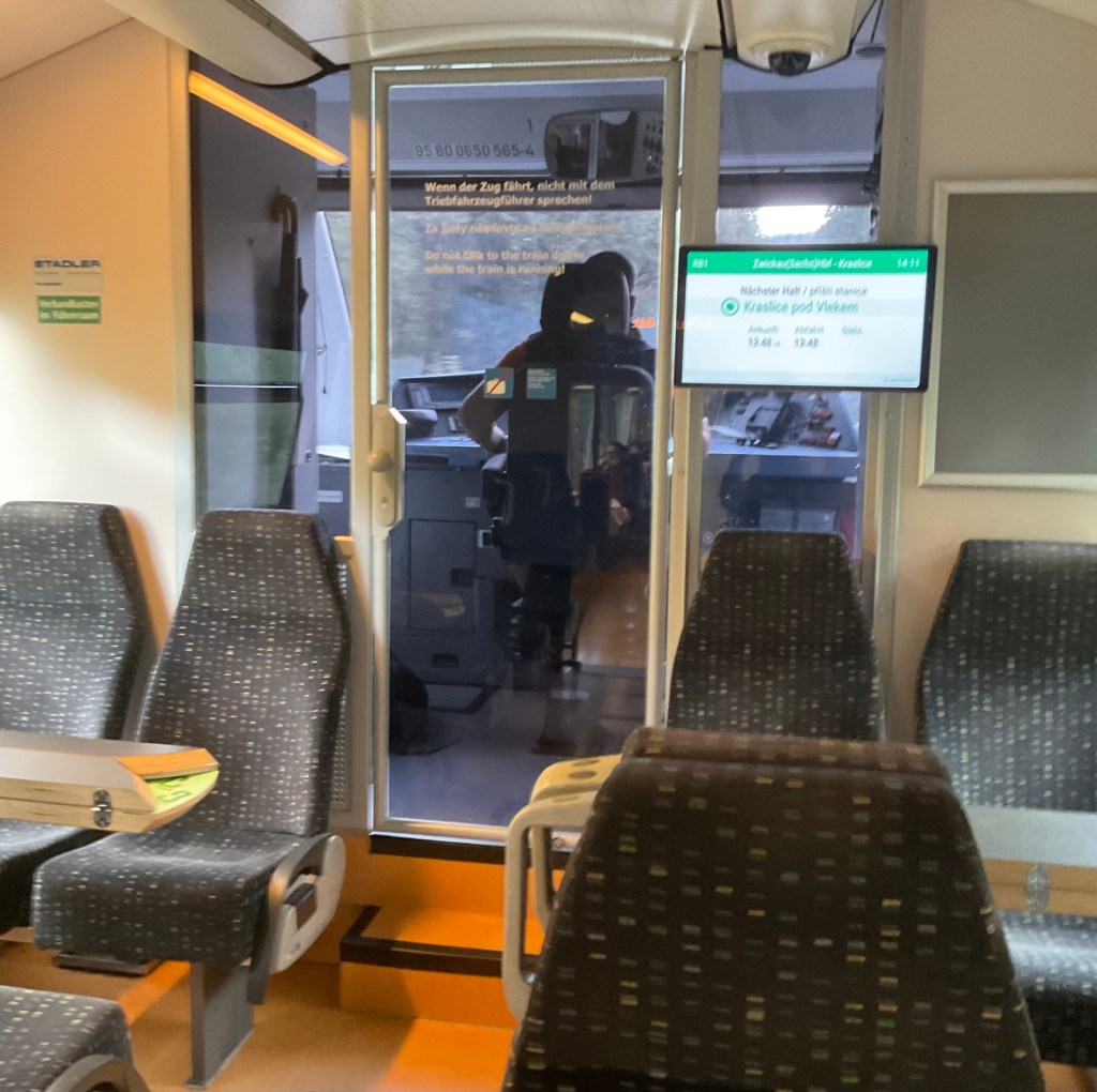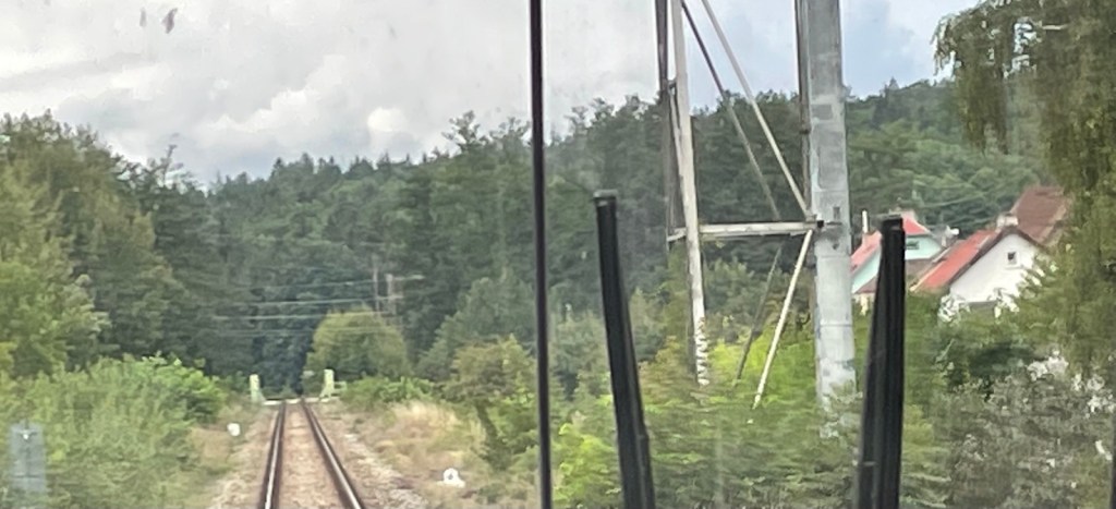 Als sie weit genug weg ist, sagen mir 2 Tschechen, die offenbar fast täglich pendeln, die Frau sei ganz schlimm; vor ein paar Wochen sei ein junger Rucksacktourist bei Regenwetter mitten im Wald aus dem Zug weg gewiesen worden. Ich widme mich wieder meinem Hobby, dem Triebfahrzeugführer durch die Glasscheibe zuzuschauen. lässig sitzt er da, widmet sich seinem Handyspiel oder schreibt eine Meldung, wobei er alle 15-30 Sekunden aufschaut, das Totmannpedal betätigt und die Strecke beobachtet.