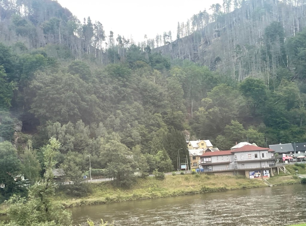 Zwischen Bad Schandau und der böhmischen Schweiz auf der anderen Seite der Grenze mit Tschechien sind am anderen Ufer etliche verbrannte Wälder zu sehen.