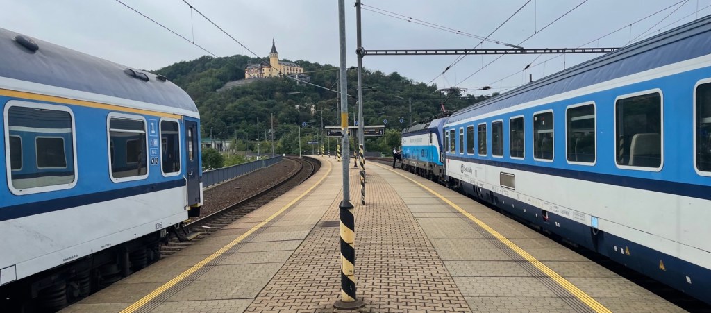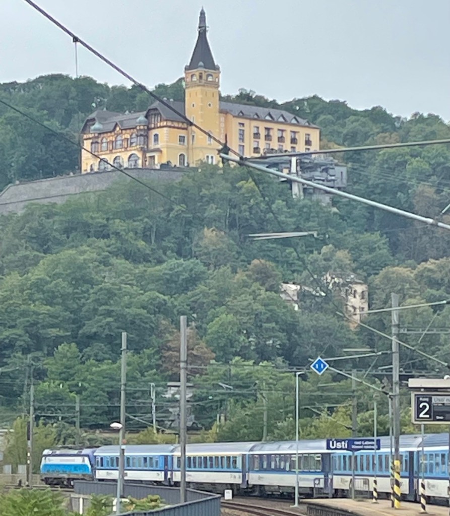 10.18 erreichen wir Ústí nad Labem (Aussig an der Elbe). Ich habe kurz Zeit den Ausblick auf das ‚Schlosshotel‘ Větruše zu geniessen und mich im intensiv modernisierten Bahnhof mit Rolltreppen, Rampen, Aufzug, von und zu den Bahnsteigen umzusehen.