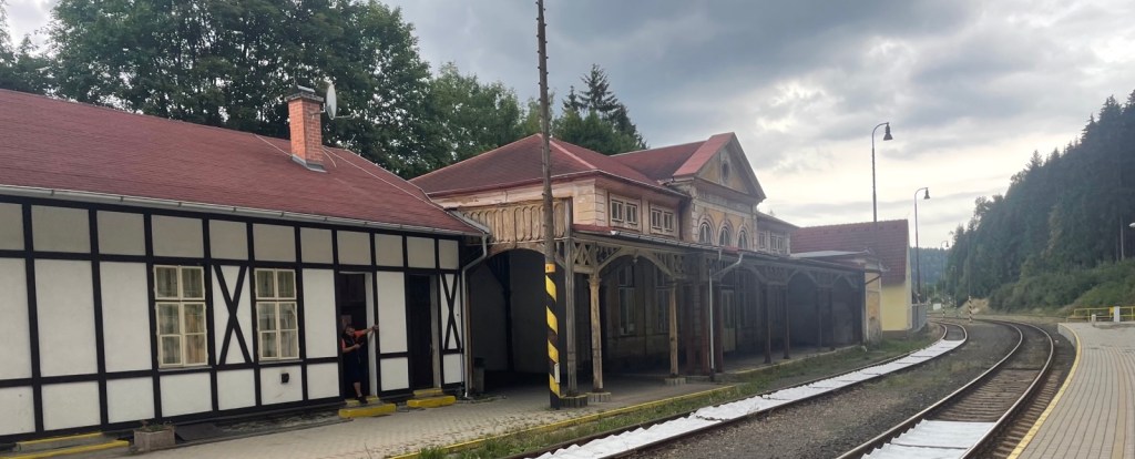 Zuerst wird das neue Gleis falsch angegeben. Als ich am Billettschalter danach frage, bescheiden mir die Damen, sie wüssten nicht wo der Zug nach Kraslice abführen würde, sie seien nur für den Fahrausweisverkauf zuständig. Als ich insistiere erhalte ich liebenswürdigerweise dann aber doch einen Zettel mit der Verbindung, woraus hervorgeht, dass der Zug auf Gleis 1, genauer gesagt auf dem 3. Gleis vom Bahnhofsgebäude aus gesehen abfährt. Also wieder runter in die Unterführung und hoch aufs Perron wo ich angekommen bin, ‚ich liebe‘ diese gegen ihre Kunden gerichteten Spielchen von Eisenbahnern.