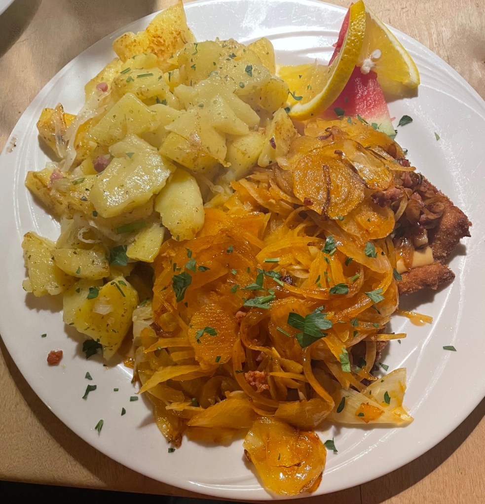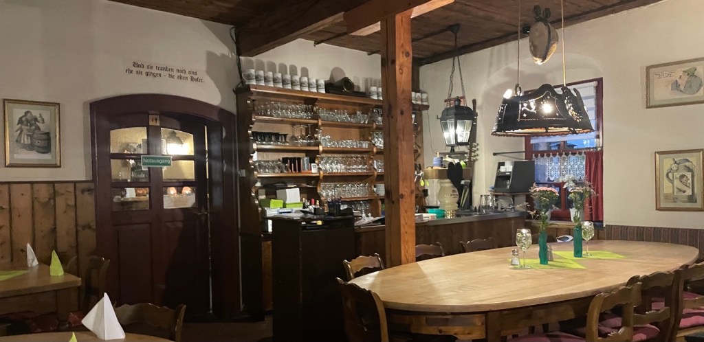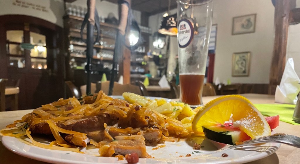 Hier geniesse ich ein dunkles Weissbier der örtlichen Brauerei Scherdel. Hinterher esse ich 2 panierte Schnitzel, komplett zugedeckt von gedünsteten Zwiebelringen garniert mit echten Bratkartoffeln. Sowas Gutes gibt es im Osten der Republik leider nirgends mehr!
