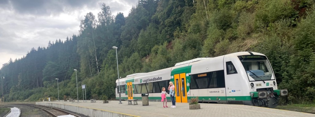 Die vermeintlich letzte Fahrstrecke des heutigen Tags dauert 100 Minuten und führt über Klingenthal – Falkenstein nach Zwickau. In Klingenthal habe ich vor 20 Jahren auf meiner Radtour von der Schweiz über den Erzgebirgskammweg nach Berlin meine heutige Eisenbahnfahrstrecke gekreuzt.