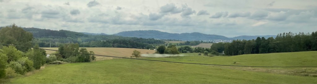 Als fahre ich 40 Minuten nach der Ankunft hier in Hof in einem Regioexpress weiter nach Hof. Ich habe leider nicht bedacht, dass heute der letzte Tag des 9 €uro -Tickets ist. Der Zug ist randvoll, auch in den Gängen stehen die Leute dicht an dicht. Auf Klappsitzen sitzen häufi mehr als eine Person und selbst Klo sind etwa ein halbes Dutzend 9 €uroReisende. In der ersten Viertelstunde der Reise muss also auch ich stehen und kann nicht zur ersten Klasse ganz vorne hingehen. Immerhin überlassen mir jüngere Reisende nach den ersten 20 Minuten einen freien Sitzplatz in der 2. Klasse.