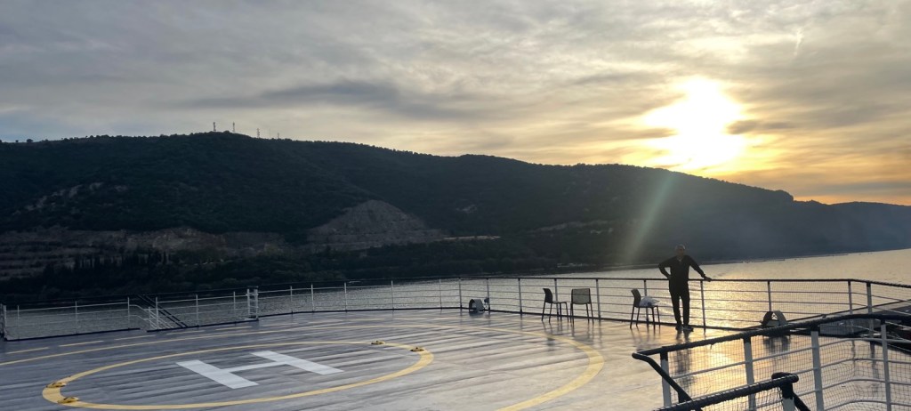 Mehr oder weniger nah der Küste zu Italien sind wir in der Nacht bis auf die Höhe von Bari vorangekommen. Nun wird allen klar, dass diese roll-on – roll-off Fähre nur etwa halb so schnell ist wie eine der heutigen modernen Fähren.