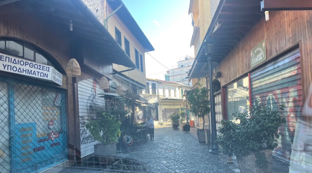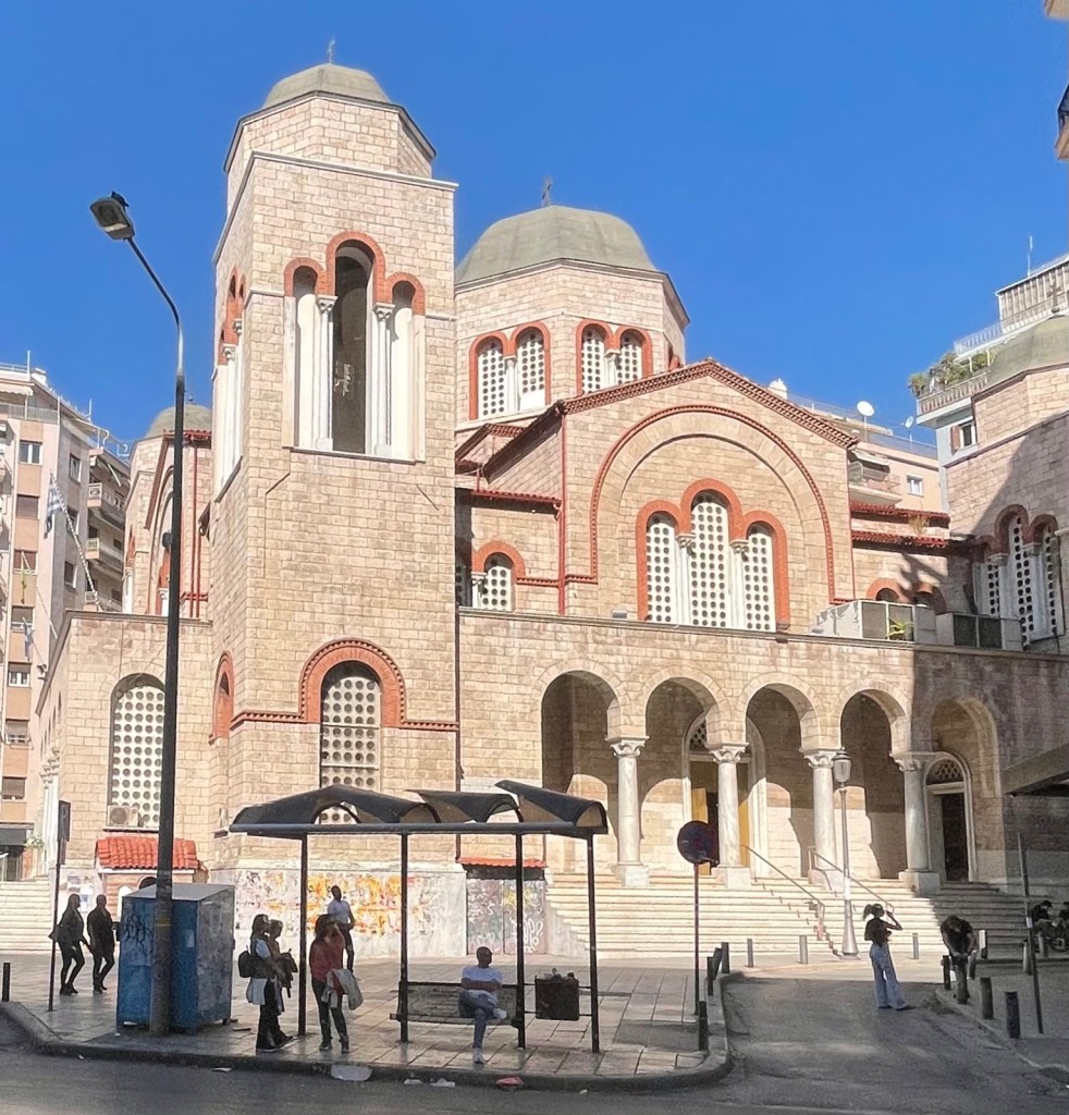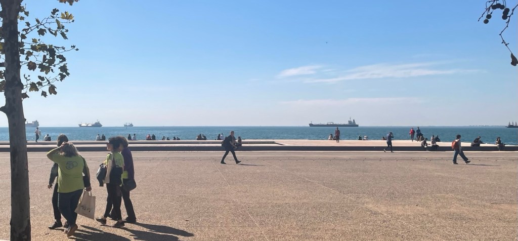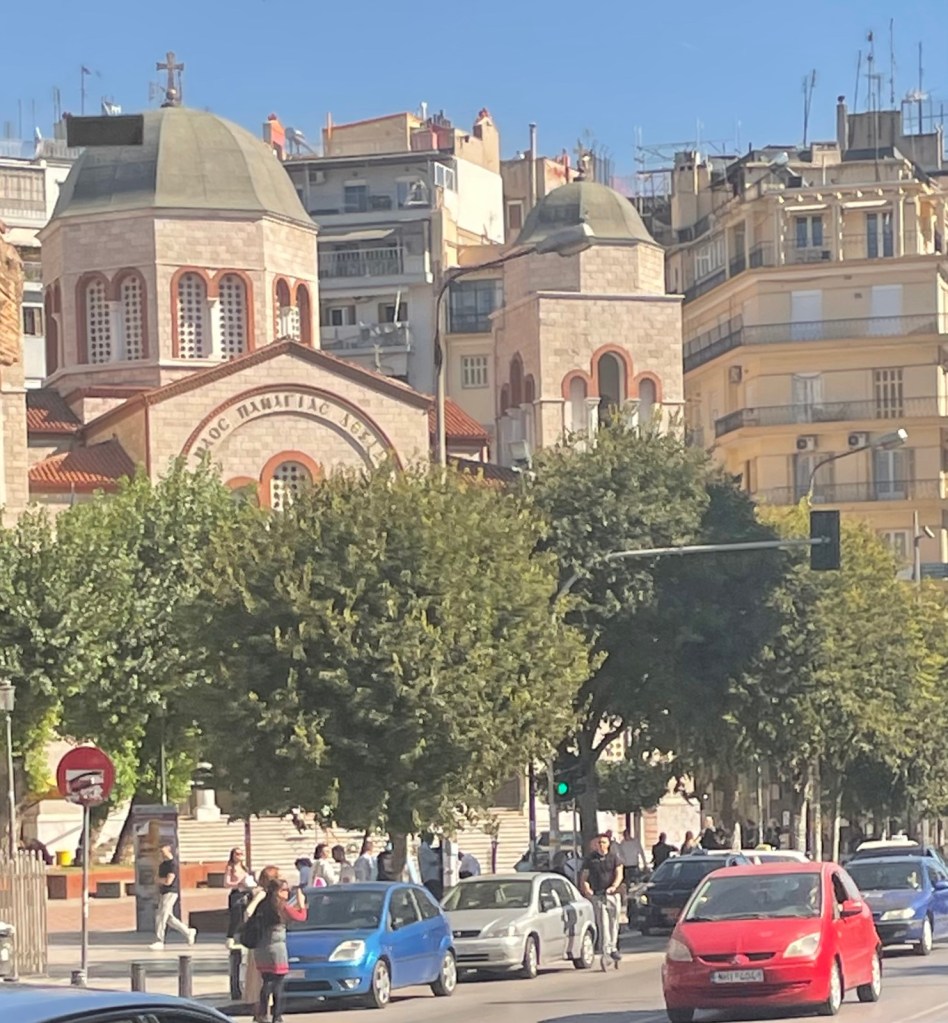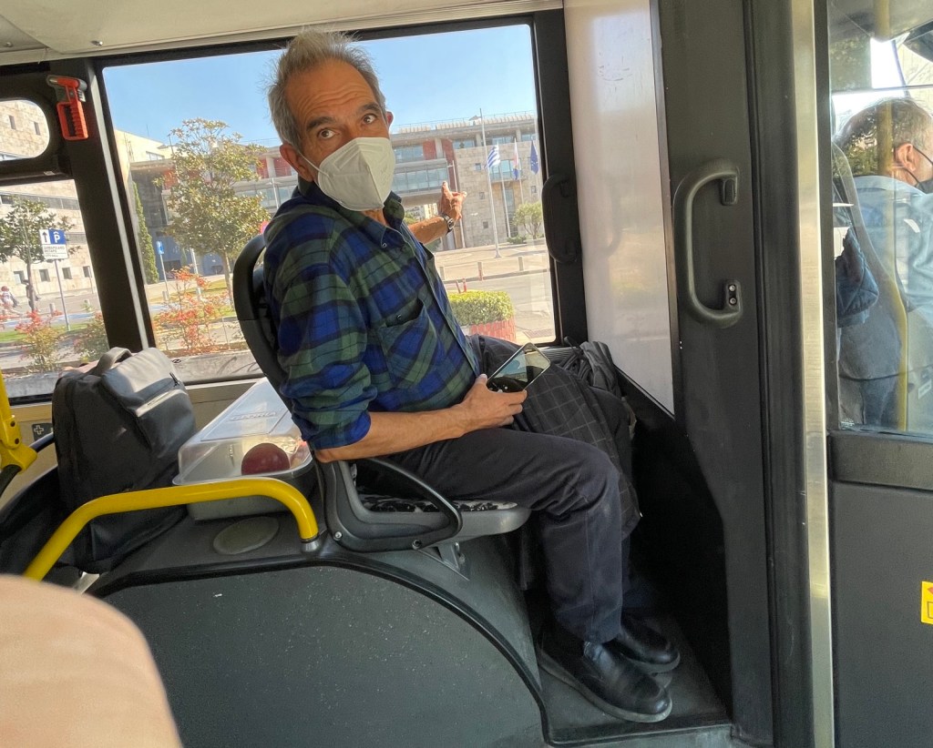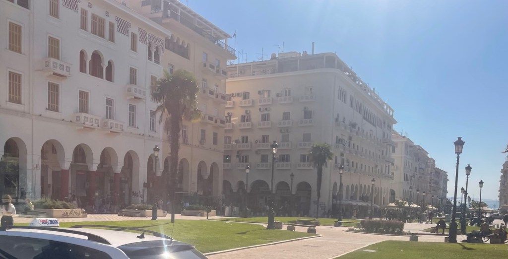 Michali hat sein Auto beim Umstieg auf das Flugzeug für in die Schweiz, am Flughafen Thessaloniki, ganz am anderen Ende der Stadt abgestellt. Wir beschliessen, anstatt mit einem teuren Taxi, mit dem wesentlich günstigeren Bus der Flughafenlinie dorthin zu fahren. Ich erhalte den vorderen rechten Frontplatz, Michali setzt sich gegenüber von mir hin und dokumentiert die Sehenswürdigkeiten der Stadt. Ein lieber Kerl!