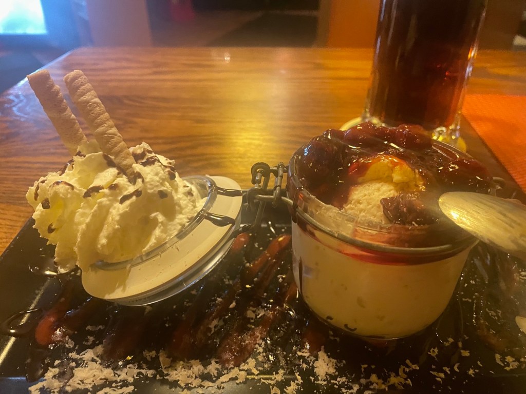 Das Essen hat mir sehr gemundet. Zum Abschluss gönne ich mir ein Marronimousse mit Weichselkirschenkompott und Schlagobers!