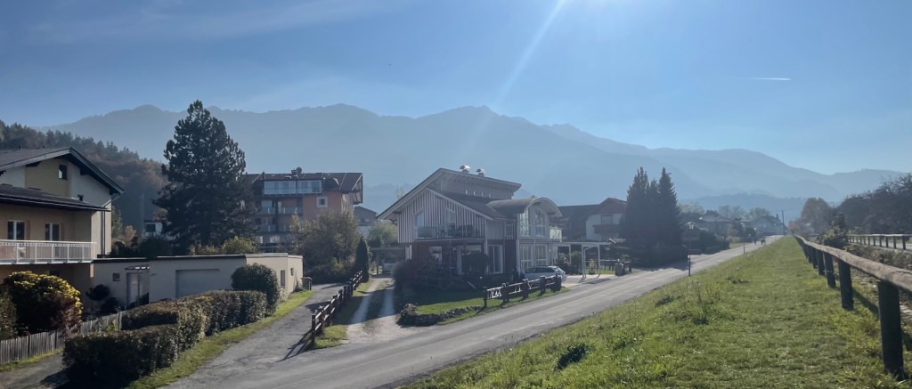 Ich habe den Zug in Faak am See verlassen, spaziere nun durch diese Ferienwohnungssiedlung runter zum See.