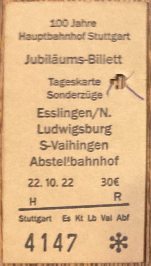Leider will die DB dieses Jubiläum nicht begehen, wohl oder gerade weil der Jubilar beziehungsweise der Konzern Deutsche Bahn AG durch die Jahrhundertbaustelle „S 21“ grad gar keine gute Figur macht. Vom denkmalgeschützten Bonatzbau steht ja im Grunde nur noch die Hälfte, denn er wurde seiner Flügel beraubt.
