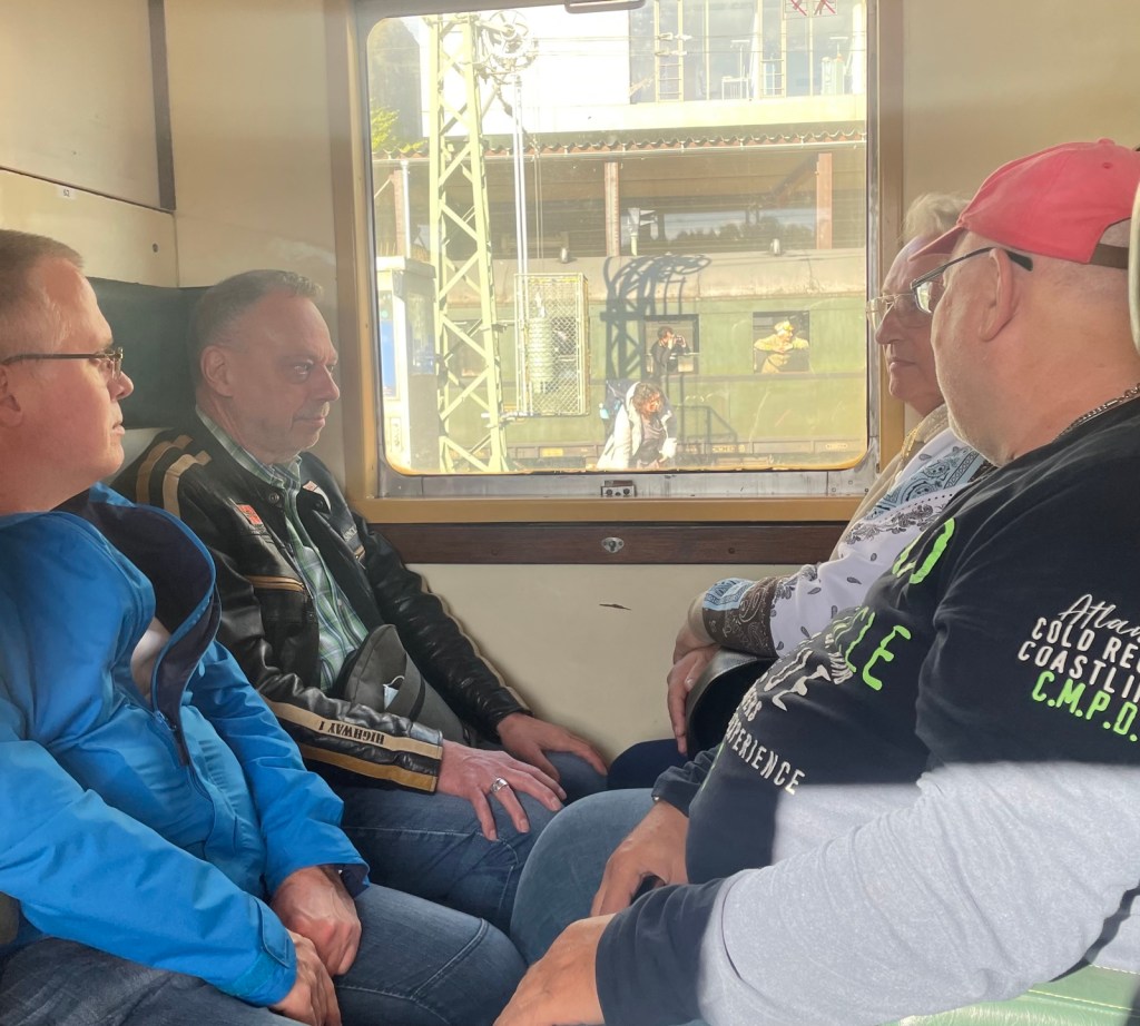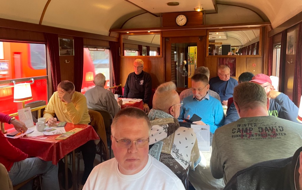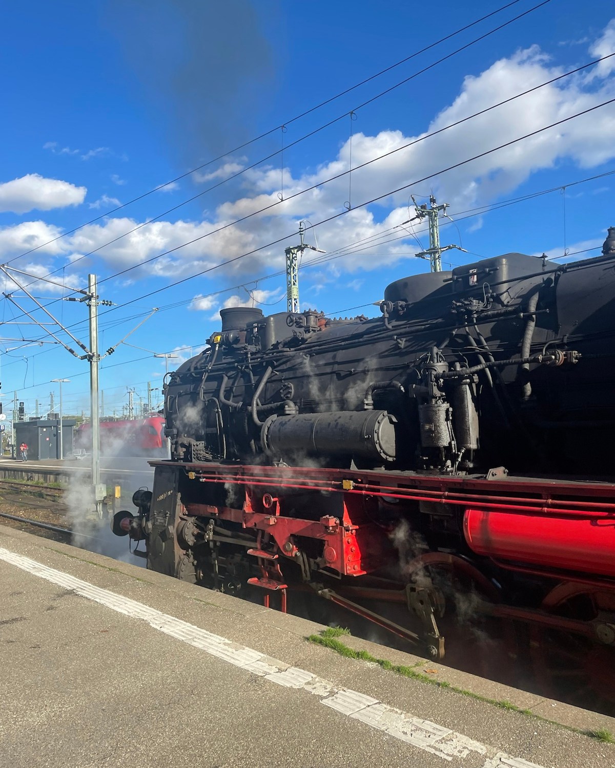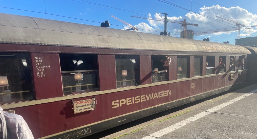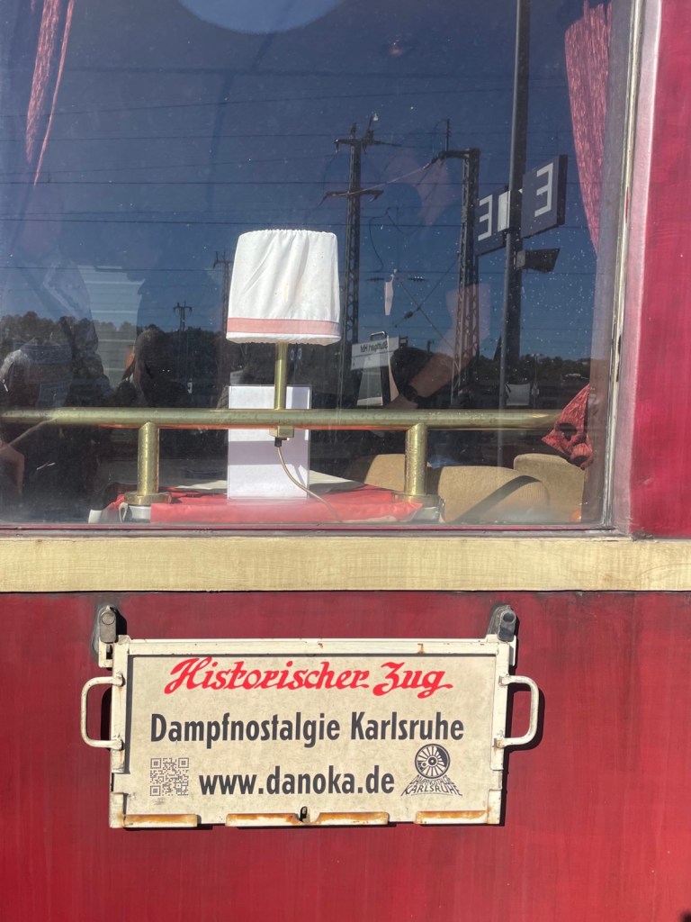 Nach der Rückkunft steigen wir in den Dampfzug der UEF um, der mit der „badischen G 12“ 58 311 und der V 100 1019 bespannt ist. Dort begeben wir uns in den Speisewagen und lassen es uns gut gehen, während wir zunächst auf Gleisen unterwegs sind, die Fahrgäste sonst nie befahren können: Es geht in den Abstellbahnhof. Dort ist zwar kein Ausstieg möglich, aber wir können die ungewohnte Perspektive genießen.