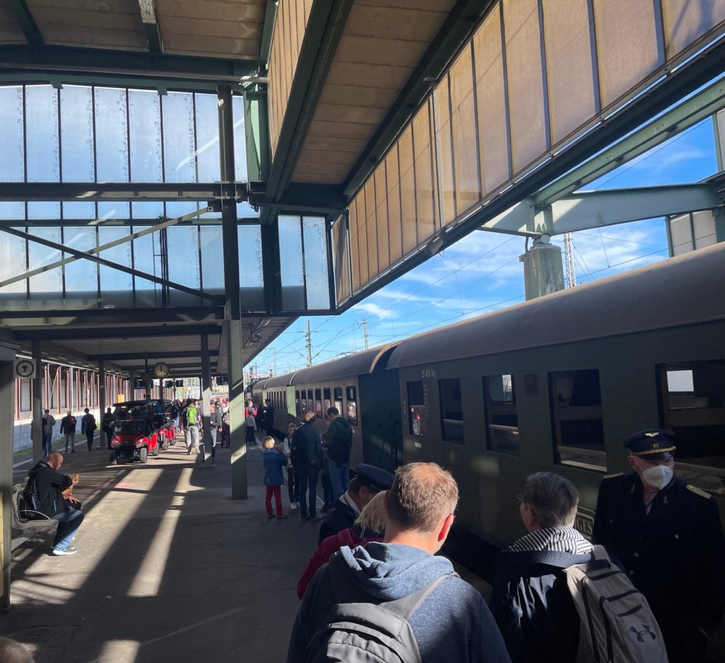 Der Freundeskreis Eisenbahn Süddeutschland trifft sich um 10:45 Uhr am Prellbock von Gleis 2 in besagtem Hauptbahnhof. Es ist schön über ein Dutzend Freunde mal wieder zu sehen.