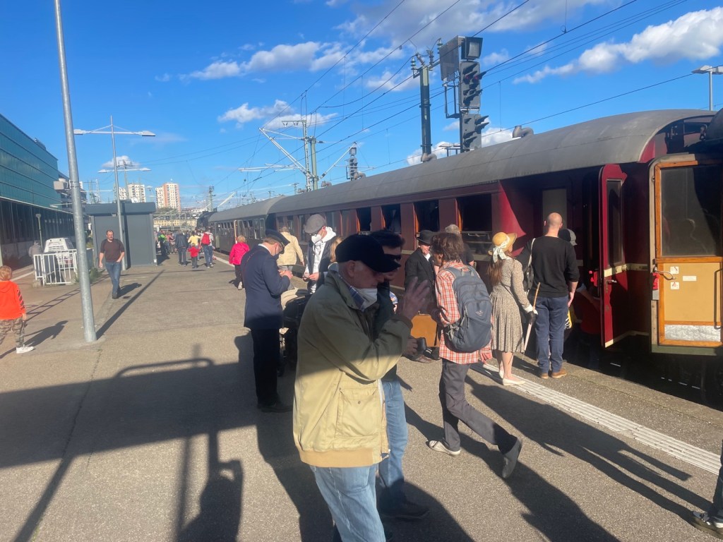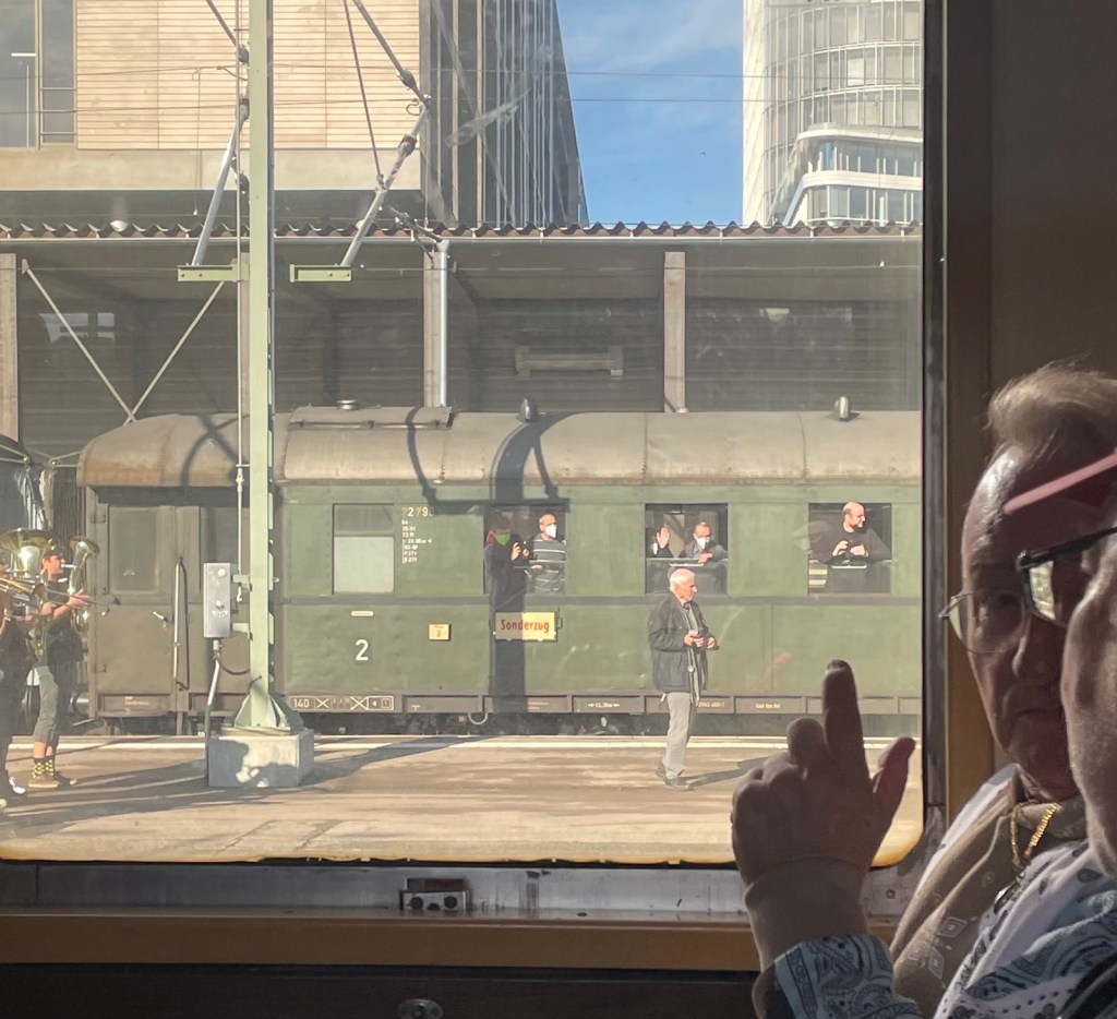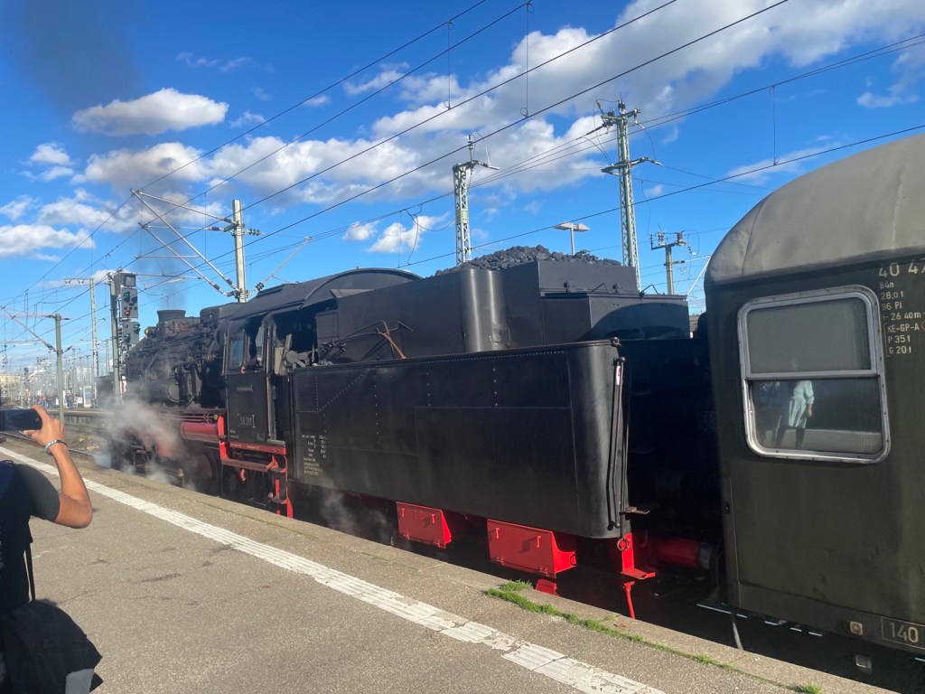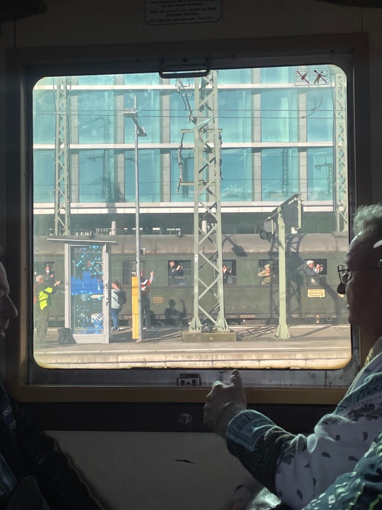 Unser historischer Zug steht ganz einfach neben einer modernen Hamsterbacke!