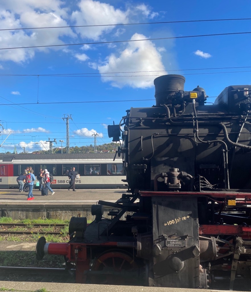 Gemeinsam fahren wir auf der Panorama-Bahn. Der historische Zug mit „Krokodil“ E 94 088 und „württ. Hz“ 97 501 startet um 11 Uhr Richtung Vaihingen.