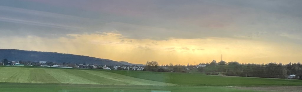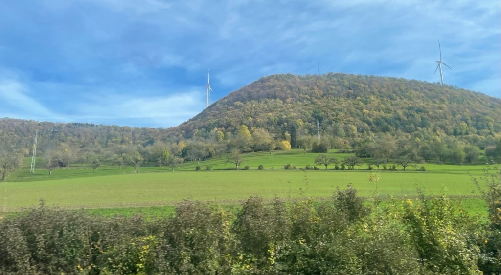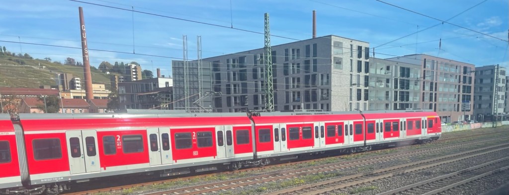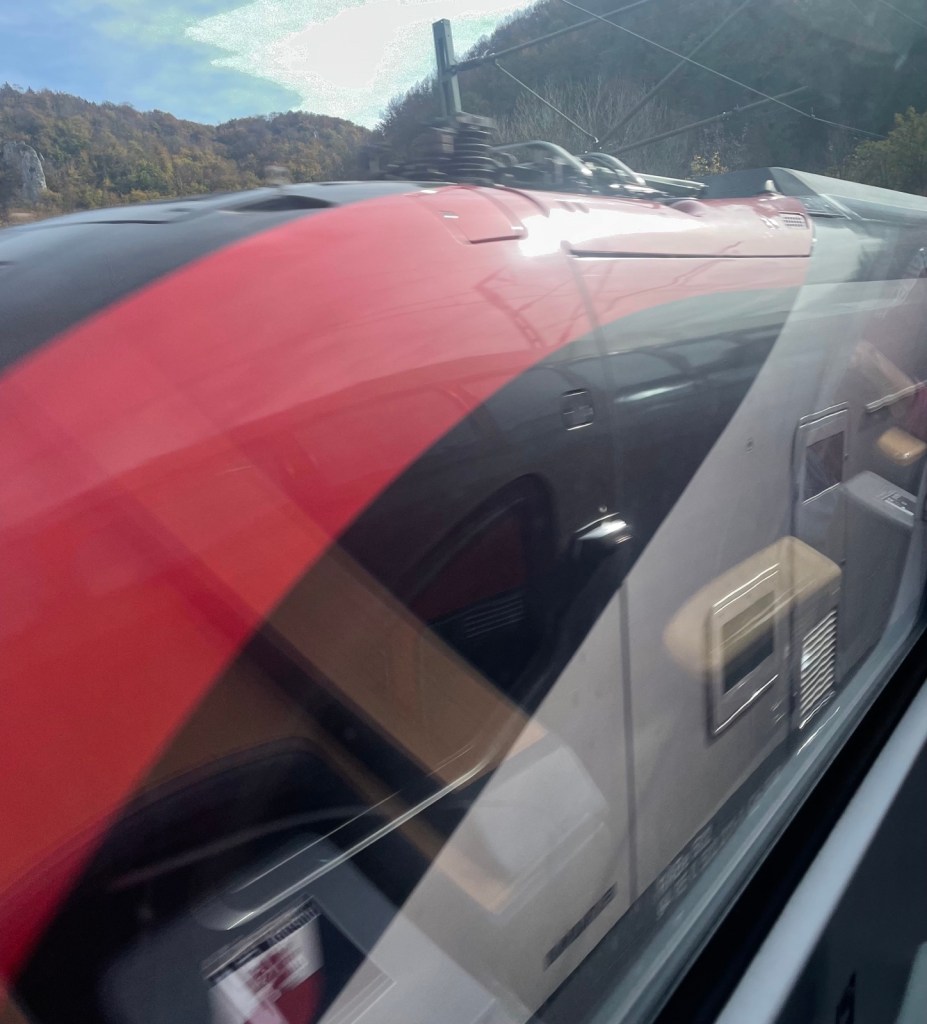 Im Bahnhof ist aller Dampf der Dampflokomotiven verraucht. Also verreise ich um 12.01 Uhr. Zuerst führt die Strecke im Neckartal mit den gelben Weinbergen, dann über die Geislinger Steige nach Amstetten und Ulm. Der Alb-Aufstieg (nicht zu verwechseln mit einem Alp Aufstieg) ist 5,6 Kilometer lang und überwindet dabei einen Höhenunterschied von 112 Metern.