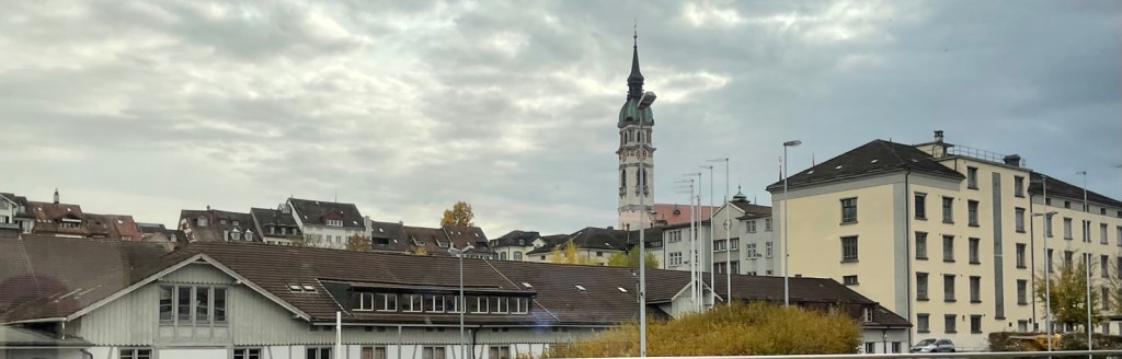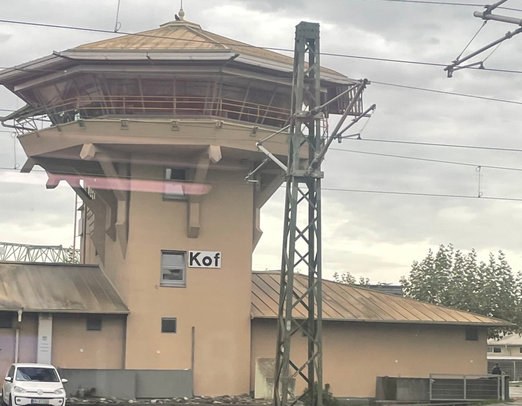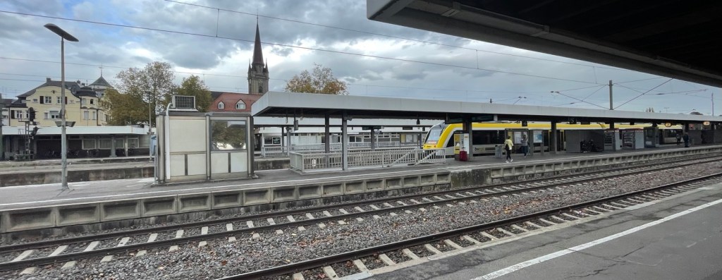 Der Stellwerksturm des Bahnhofs Konstanz ist riesig. Ob er wohl noch in Gebrauch ist? Umsteigen am gleichen Bahnsteig auf den 4 Minuten nach Ankunft abfahrenden Interregio nach Weinfelden – Winterthur – Zürich Flughafen – Zürich Hauptbahnhof.