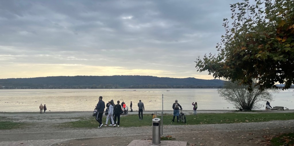 Radolfzell, hier darf ich umsteigen auf einen Seehas entlang des Gnadensees bis nach Konstanz an der Grenze zur Schweiz. Ich habe 12 Minuten Zeit; zudem fährt der Zug am nächsten Gleis zum See, also kann ich ein paar Minuten spazieren. Milde Temperaturen von über 20 Grad Celsius animieren viel Volk zu Spass und Spiel am Seeufer.