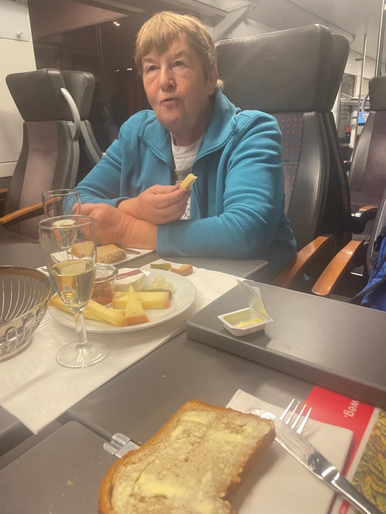 Zur Einstimmung auf die Ferien genehmigen wir uns im Zug ein Gläschen Weisswein sowie etwas Käse und Brot.