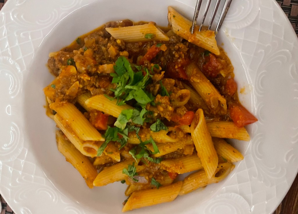 Beim Abendessen versuche ich heute gezielt weniger zu essen. Sehr viele wohlschmeckende Dinge, vor allem auch Fleisch, lasse ich fast komplett beiseite.