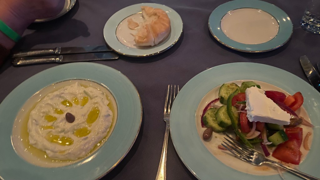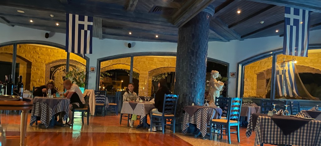 Abendessen beim Griechen innerhalb des Resorts, in der Taverna Kiriako‘s.