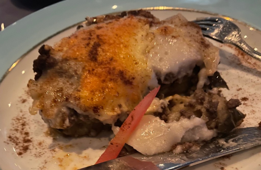 Nicht nur die Einrichtung, sondern auch die Speisen sind einem gewaltigen Klischee entsprungen. Ausser dem Chef der Gaststätte spricht kein Mensch griechisch, aber immerhin wünscht er auf meinen Gruss auf Griechisch, ebenso auf Griechisch einen guten Abend. Dafür erhalten wir dann einen guten Schluck Ouzo umsonst.
