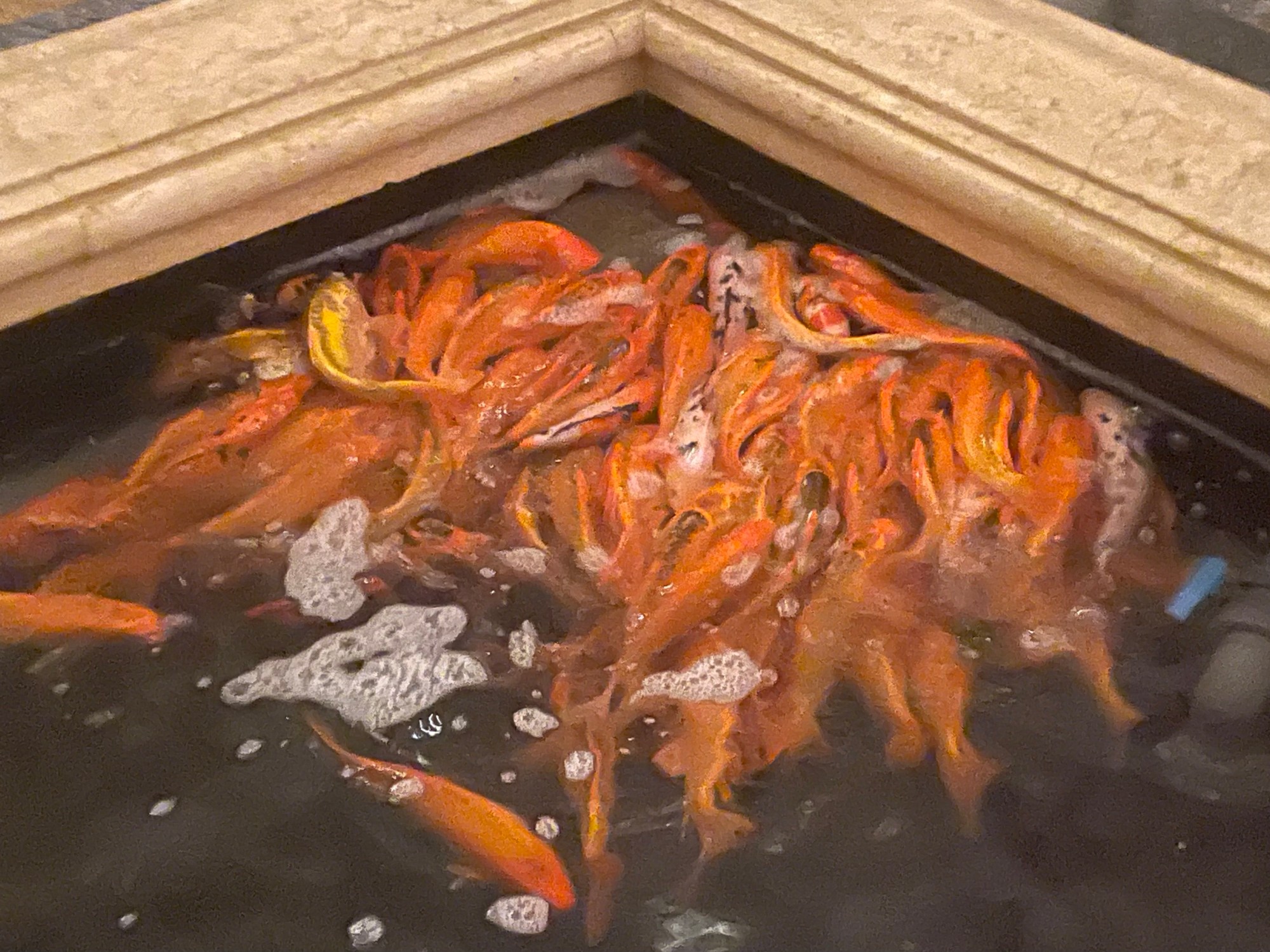 Haben auch die Koi im Lobbyteich etwas Ungewohntes gegessen? Oder warum drängeln sie sich alle in der südöstlichen Ecke des Teichs und versuchen auf der Seite beziehungsweise auf dem Rücken zu schwimmen?
