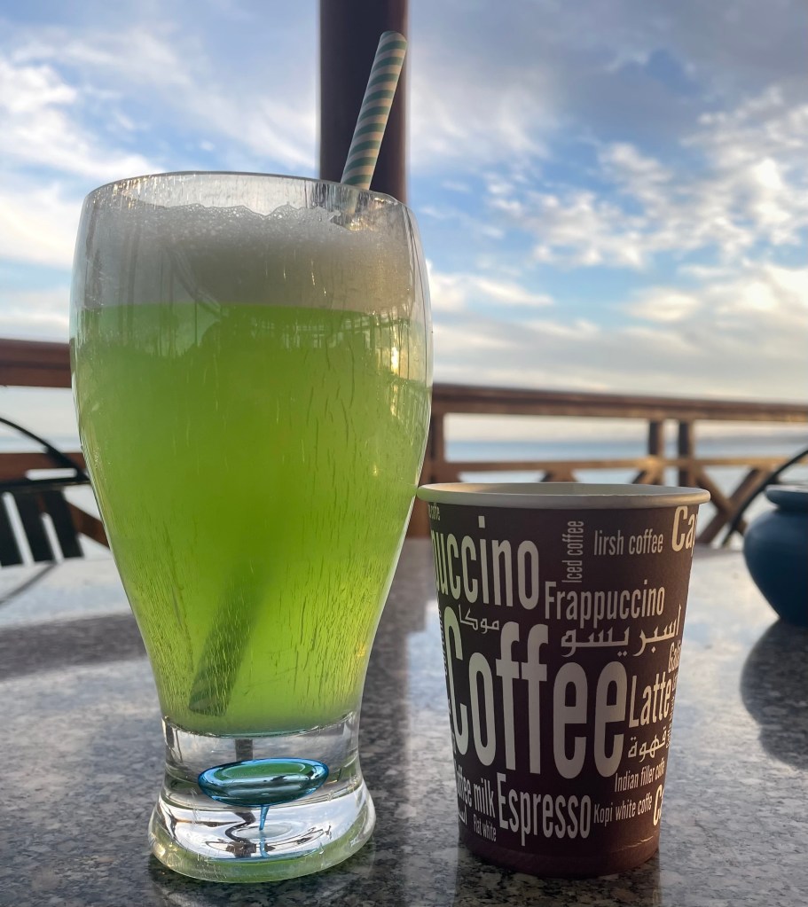 Nachmittagscocktail (natürlich ohne Alkohol) und schwarzer Kaffee am Strand.