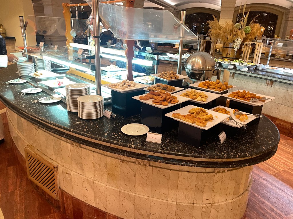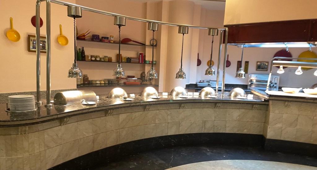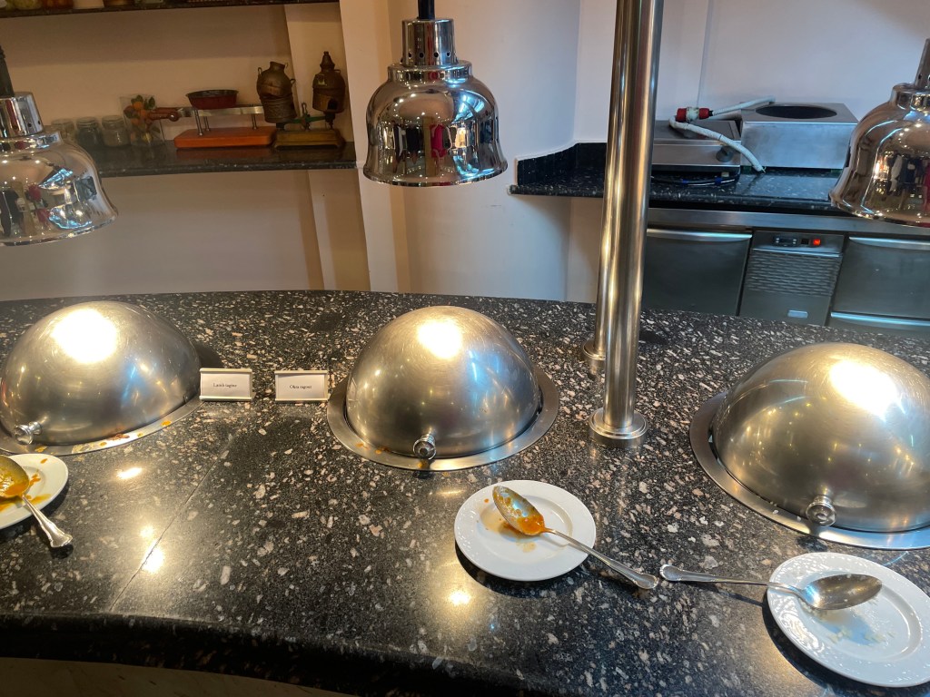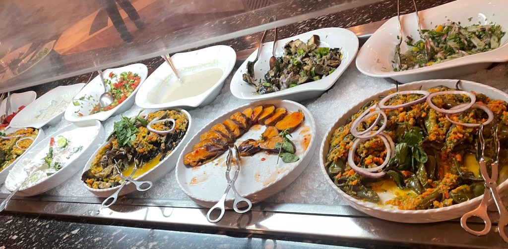 14 Schüsseln mit lauwarmen bis heissen Hauptspeisen: je 2 Arten Lammragout, 3 Arten gegrillter Fisch, 1 Mal gegrilltes Rindfleisch, 2 Mal Poulet und 1 Mal Ente sowie unzählige Beilagen.