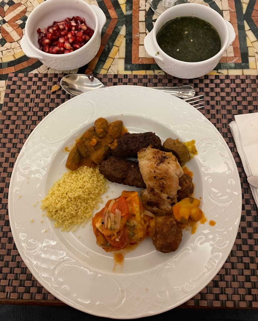 Abendessen: zu Beginn eine Kräutersuppe (oben rechts) und dann ein kombiniertes Allerlei vom Fisch und Fleisch (unten Mitte), passend dazu Granatapfelkerne (oben links). i