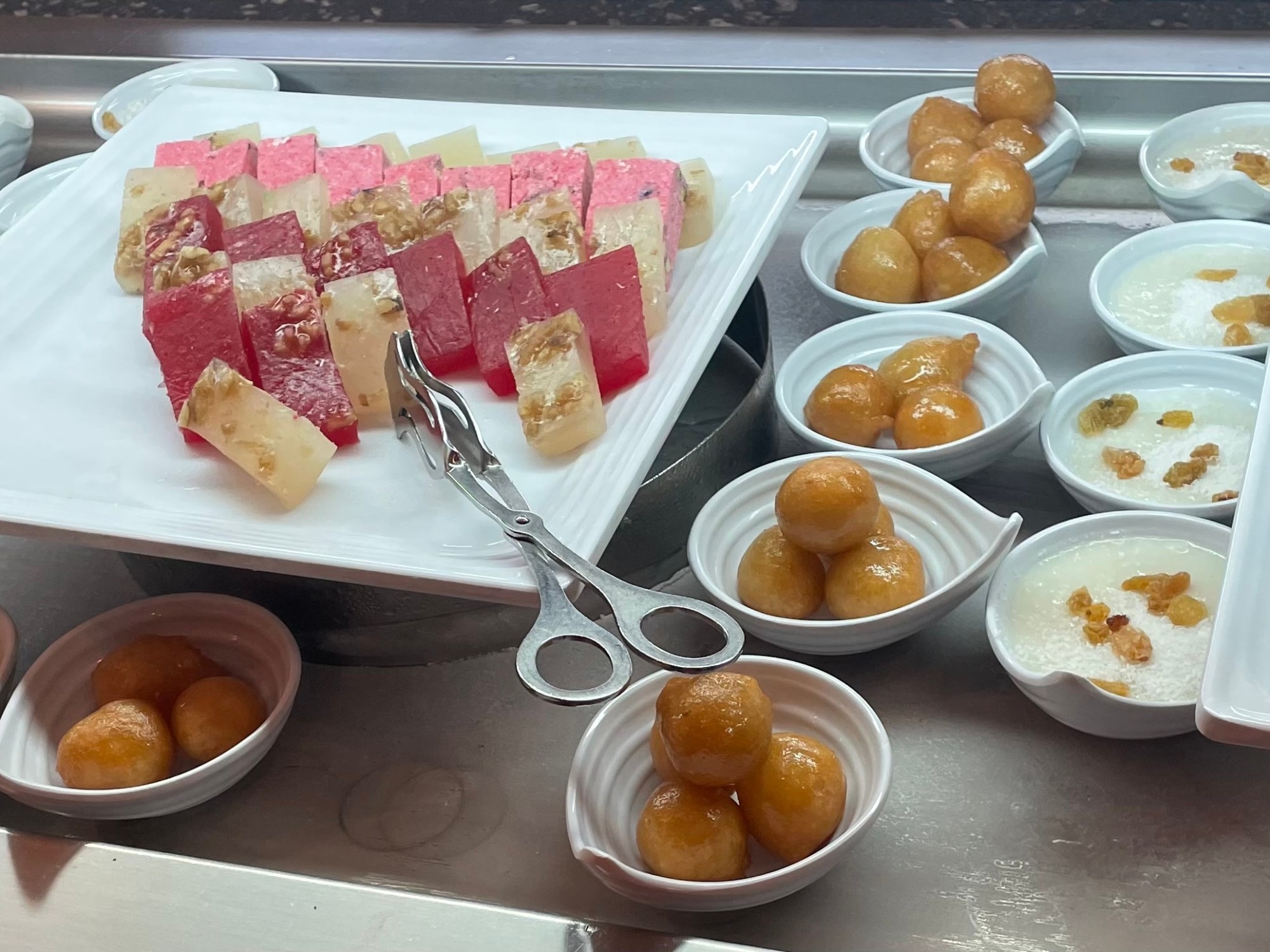 6 süsse Nachspeisen und 8 Sorten süsse Stückchen ägyptisches Gebäck.