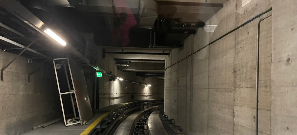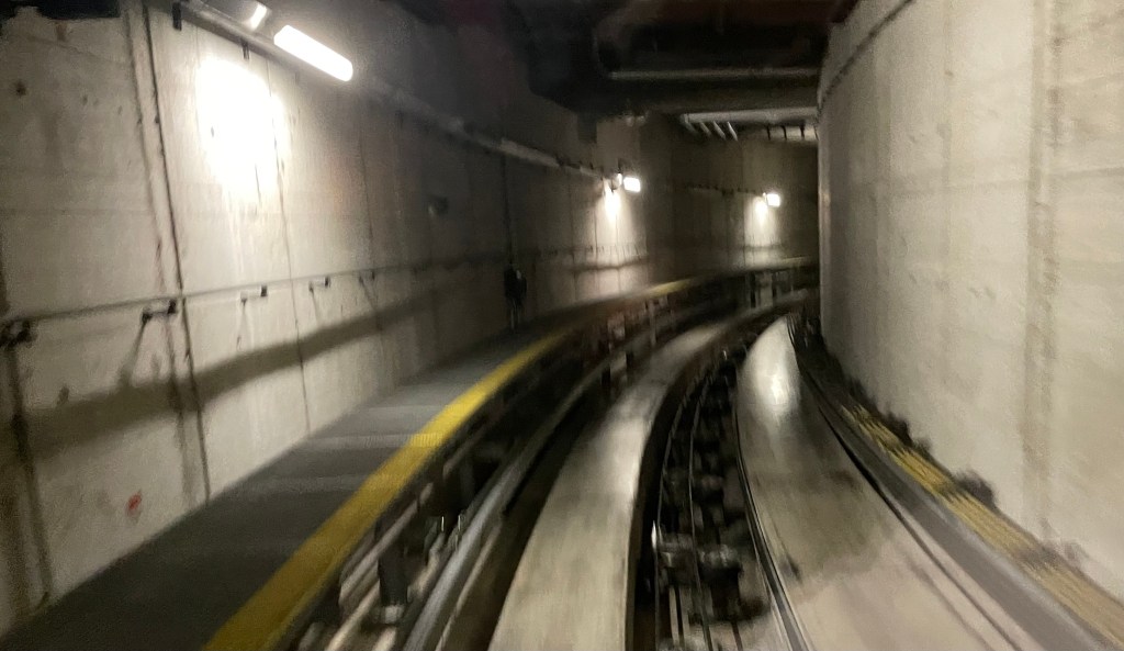 Über unzählige Rollbänder und -treppen erreichen wir bald einmal Midfield-Bahnhof. Mit der Untergrundseilbahn …