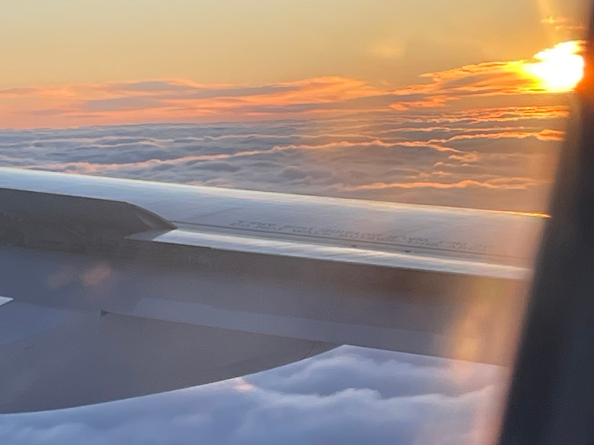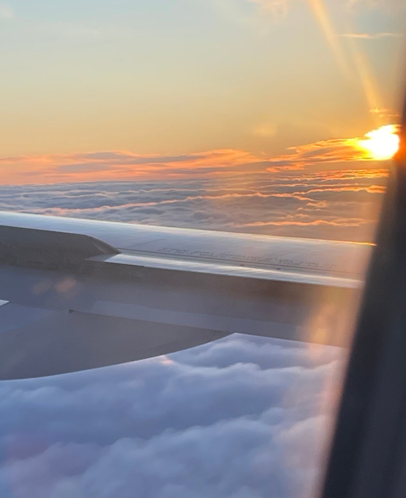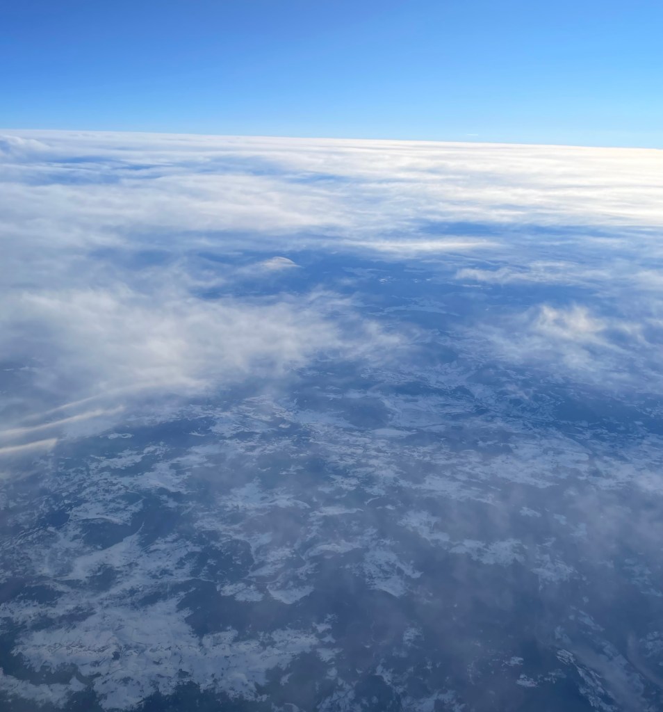 Nur langsam steigt der Flieger in grössere Höhen. Ich nehme an, es sei dem kräftigen Nordwestwind geschuldet, dass wir immer noch relativ langsam, nämlich mit nur etwas mehr als 700 Stundenkilometern fliegen. Zudem wird wahrscheinlich auch noch möglichst viel günstigerer Treibstoff für den Rückflug mitgeführt.