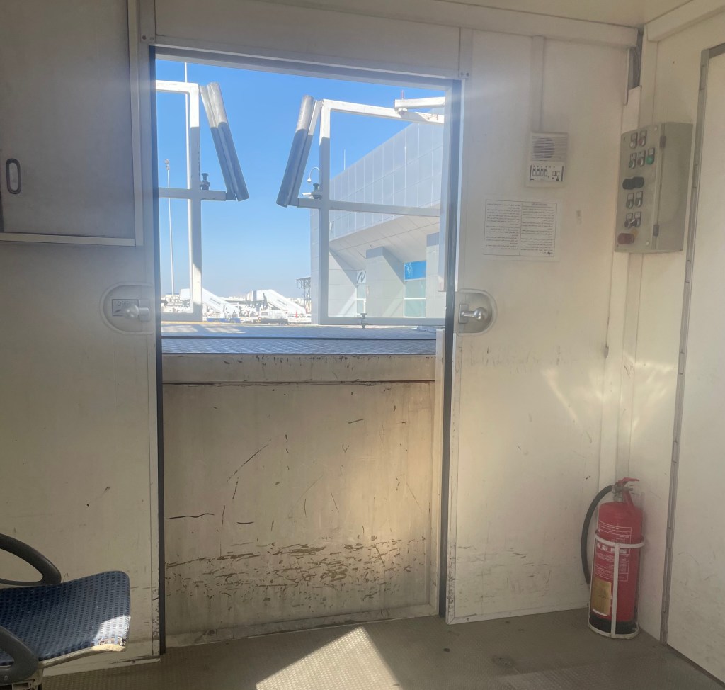 Der Fahrer gibt nicht auf und fährt vor die nächste Türe. Hier werden eben die Fluggasttreppen weggefahren und die Flugzeugtüren sofort geschlossen. Mein Fahrer fährt vor die letzte Türe, da wo noch Verpflegung geladen wird. Heftiges Geschrei draussen. Dann fährt der Versorgungslastwagen weg und die Flugzeugtüre wird geschlossen.