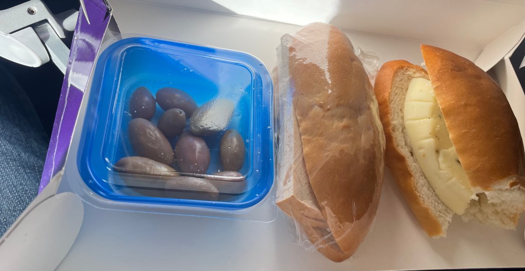 Während dem Überfliegen von Kairo beginnt der kostenlose Mittagsservice: 1 Becher Mineralwasser, 12 Oliven und 2 Wüstenluft getrocknete Sandwiches mit undefinierbarem Fleischkäseinhalt. Gut dass ich noch 1 angefangenes Fläschchen Wasser dabei habe, sonst würde ich wohl am Sandwichstaub ersticken.