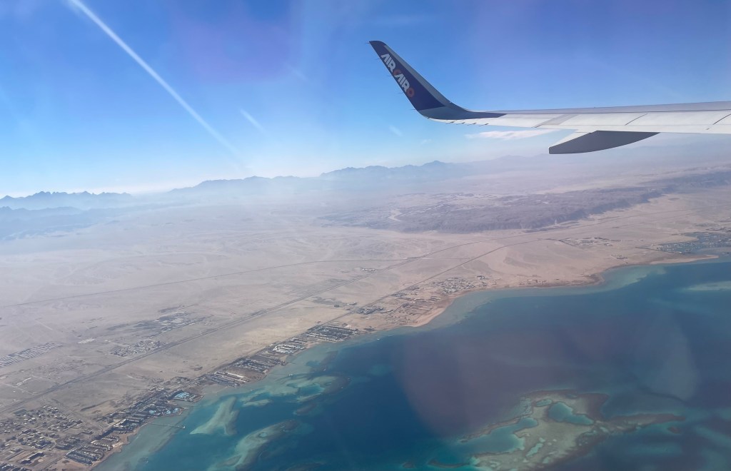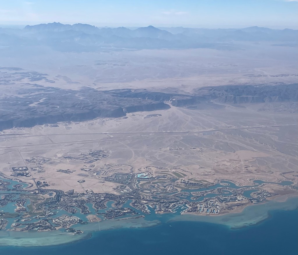Kaum 4 Minuten in der Luft, sehe ich unter mir das 1989 von Samih Sawiris errichtete Ferienresort El Gouna. Das Feriendorf ist knappe 5 Kilometer lang und 2 Kilometer breit und beherbergt unter anderem 19 Hotels. Ich hoffe, Sawiris Resort in Andermatt werde einmal nicht analog aussehen.