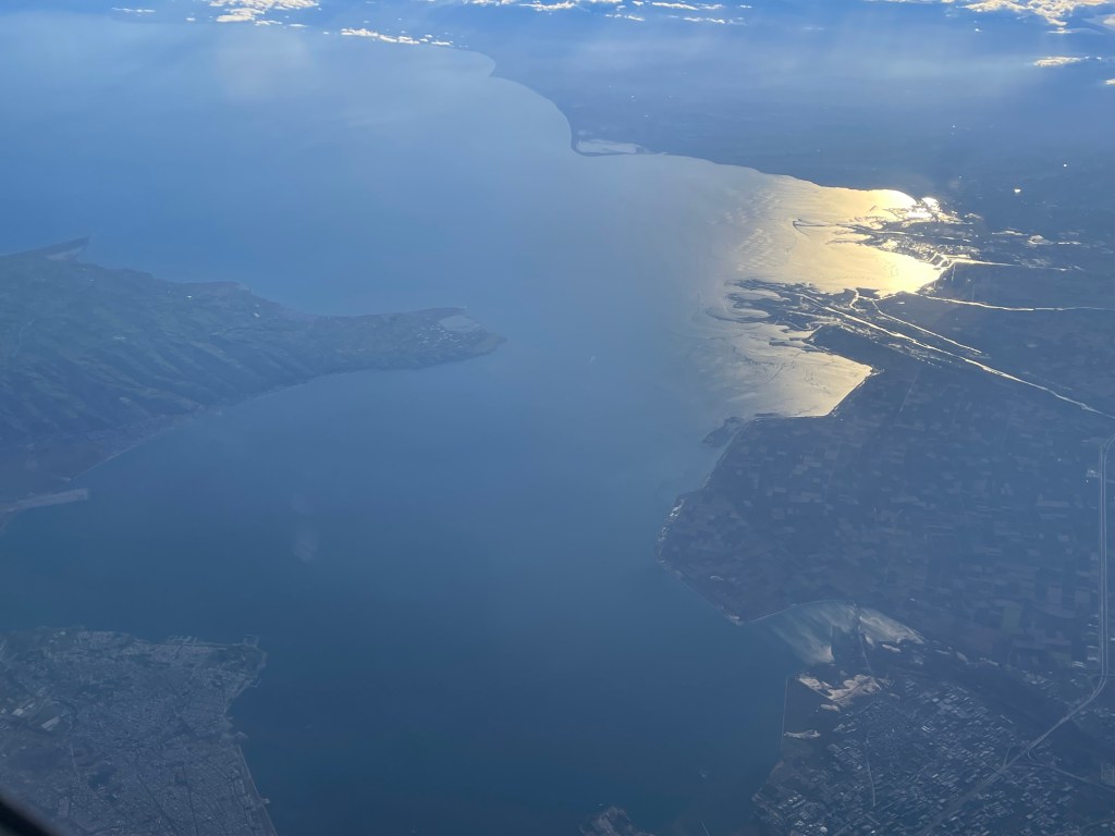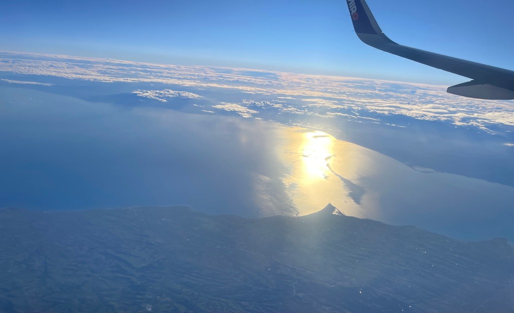 15 Minuten später wecken mich ein paar Turbulenzen. Wir fliegen eben an Kassandria entlang. Ganz hinten noch knapp zu erkennen ist Afitos. Bis ich verschlafene Socke die Handykamera bereit habe, haben wir auch schon den Kanal bei Potidea hinter uns gelassen und fliegen übers Gebirge östlich von Thessaloniki. Warum musste ich pennen und war nicht bereit die schöne und mir bestens bekannte Landschaft von oben zu studieren!