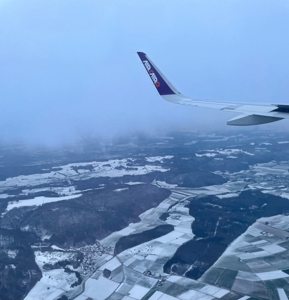 Auf 2500 m über Meer tauchen wir in die Wolken ein. Nach einer 180° Kurve beginnt der letzte Teil des Landeanflugs. Über Waldshut werden die Turbinen noch einmal lauter. Wir fliegen eine 360° Kurve, einen vollen Kreis. Offenbar haben wir noch keine Landeerlaubnis.