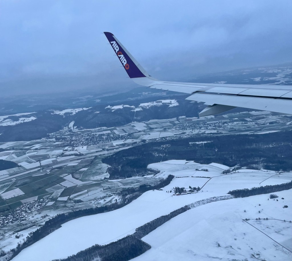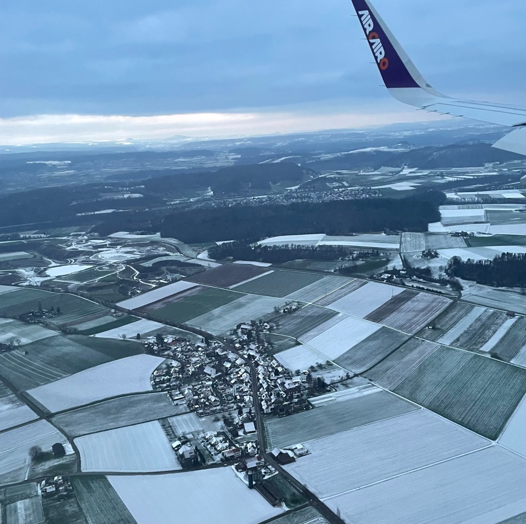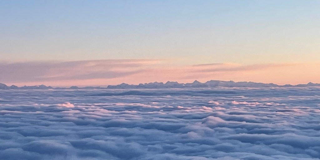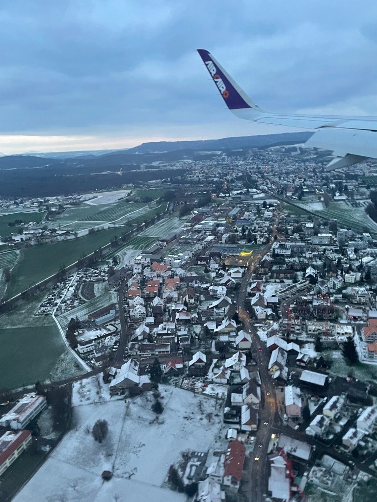 Irgendwo über Österreich beginnt der Sinkflug. Auf der Höhe von Kempten im Allgäu drehen wir Richtung Westen ab und fliegen dem Bodensee zu. Als wir die Schweizer Grenze erreichen, steht die Sonne schon sehr tief. Noch leuchten die Wolken und die Schweizer Berge im Hintergrund um die Wette.