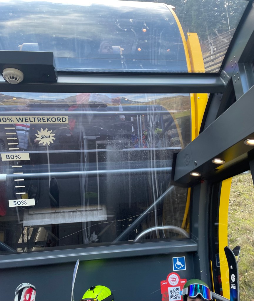 Es warten nur etwa 60 Menschen auf die Fahrt. Als die Ausgangstüre aufgeht, wird trotzdem rücksichtslos gedrängelt. Ich kann nicht mehr so schnell laufen, also drängeln sich alle Unanständige an mir vorbei um einen der wenigen (total 20) Sitzplätze zu ergattern. Ich werde hin und her geschubst, habe plötzlich etwas Spitziges in der Kniekehle und kurz darauf einen Skihelm an den Rippen. Die Skifahrer*innen drängeln als würde gleich die letzte Bahn abfahren.
