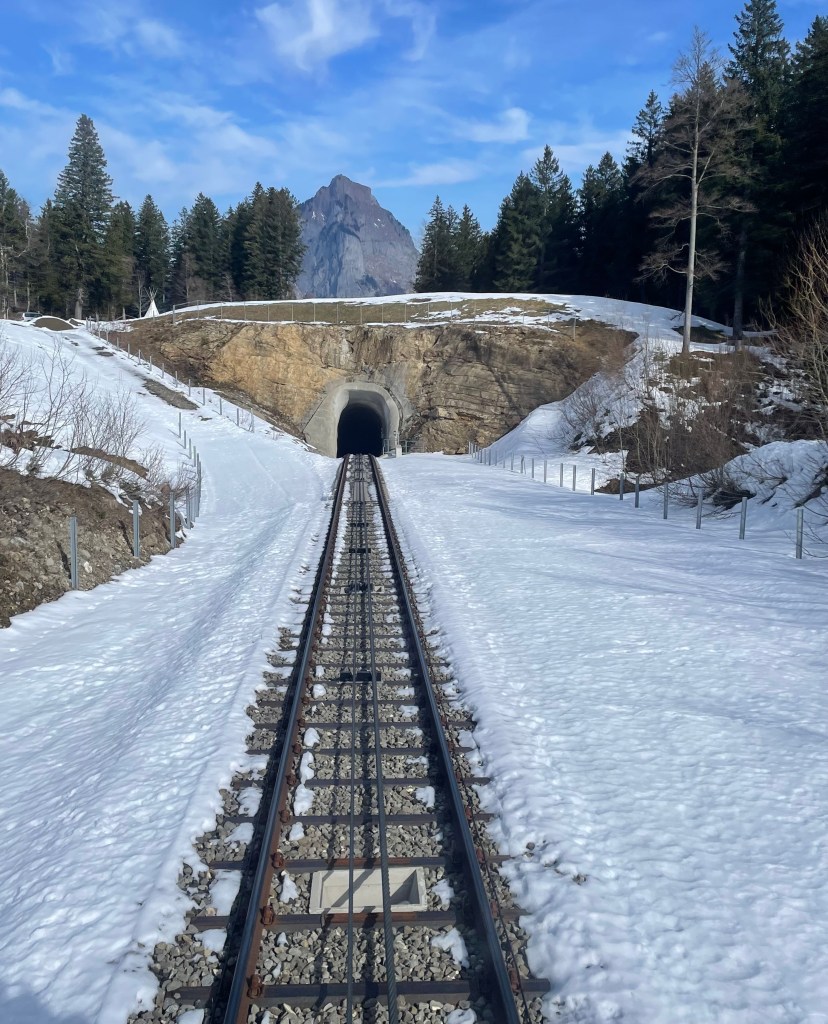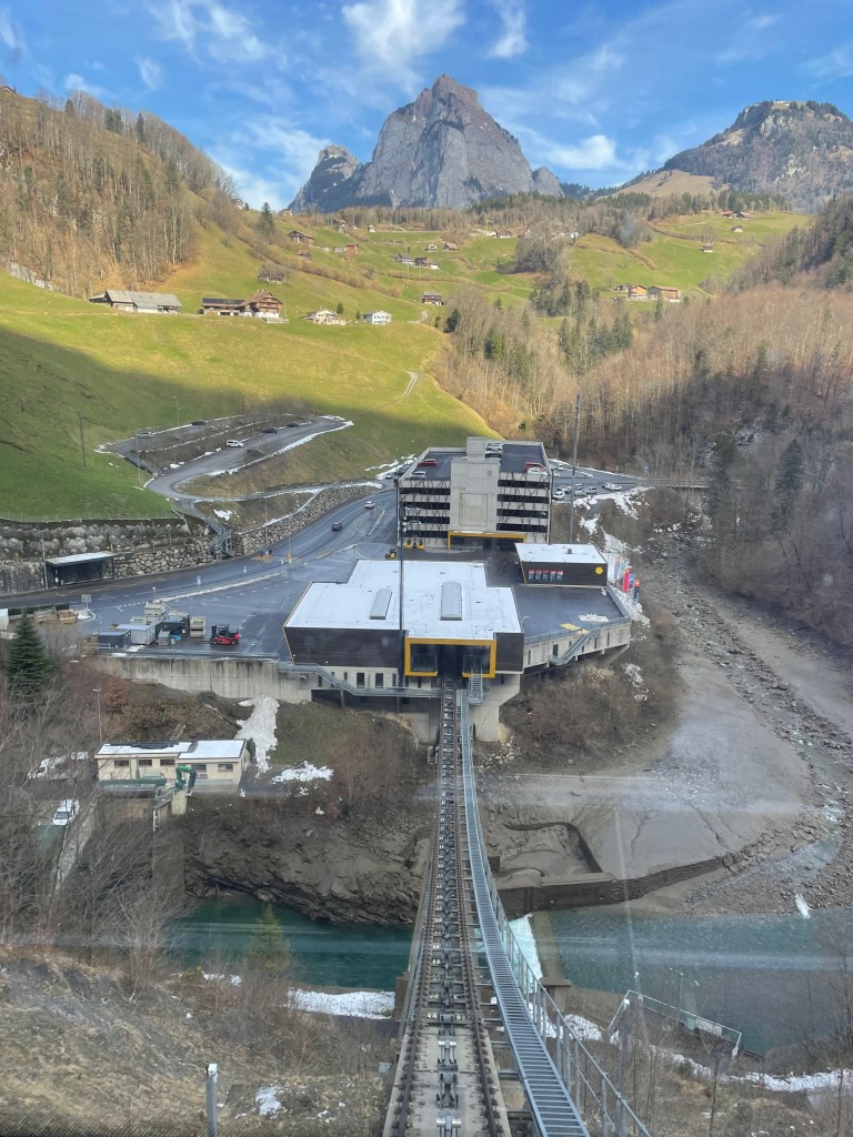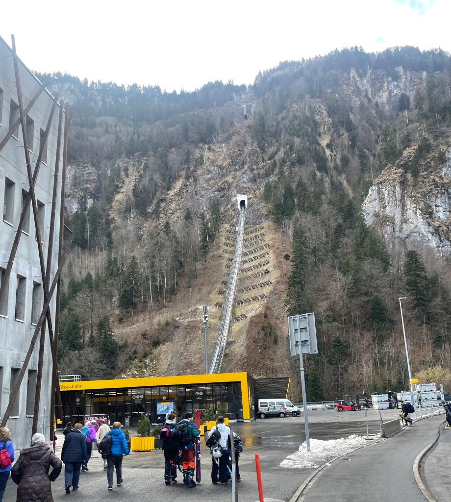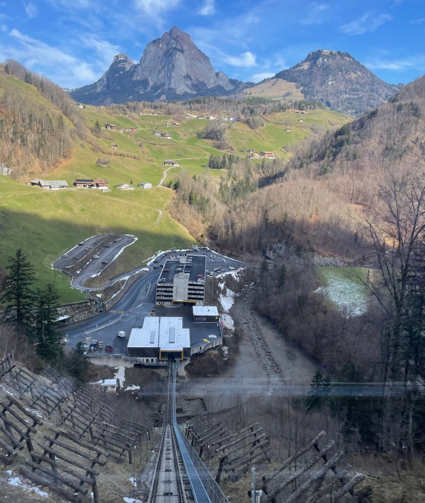 Kurz vor 11:30 Uhr steigen wir an der Talstation der neuen Stoosbahn aus. Die neue Talstation der neuen Standseilbahn ist rund 350 Meter weiter im Tal innen, da wo der Berg offenbar noch weniger stark zerbröselt und abrutscht und wo ein schnurgerader Streckenbau bis zum Dorf möglich war.
