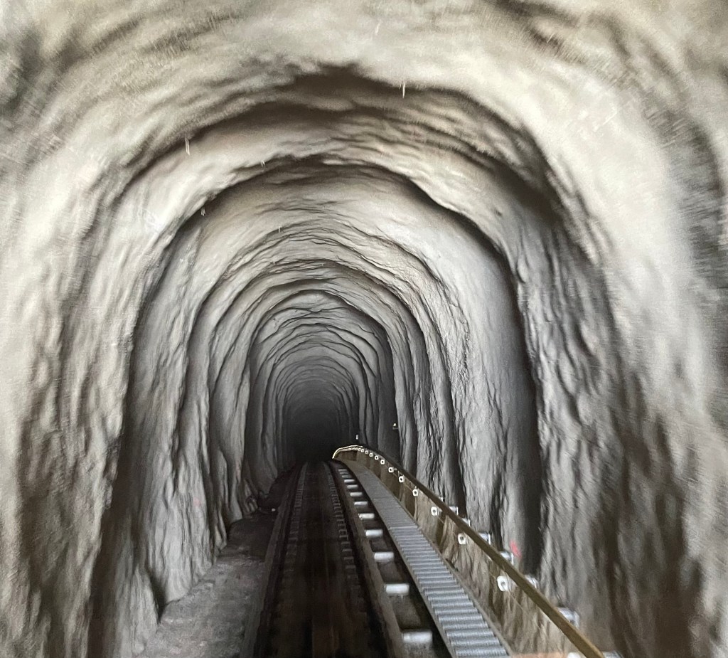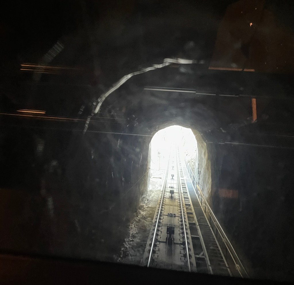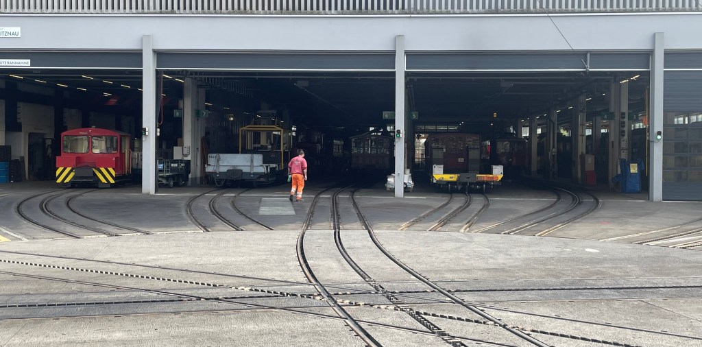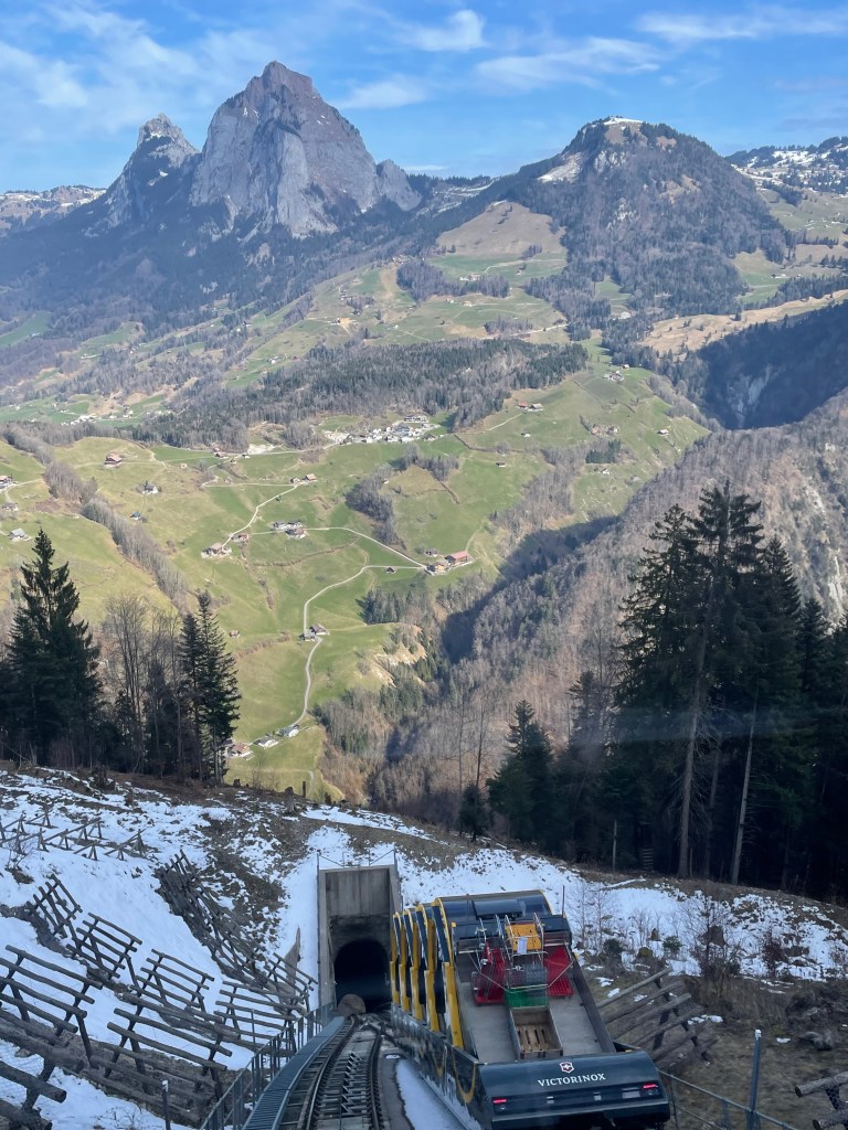Kurz vor 11:30 Uhr steigen wir an der Talstation der neuen Stoosbahn aus. Die neue Talstation der neuen Standseilbahn ist rund 350 Meter weiter im Tal innen, da wo der Berg offenbar noch weniger stark zerbröselt und abrutscht und wo ein schnurgerader Streckenbau bis zum Dorf möglich war.