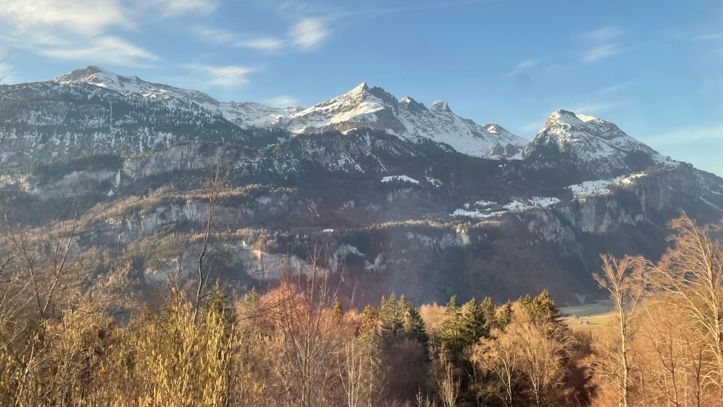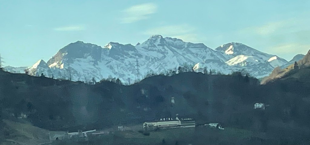 Kurz vor Giswil und dem Sarnersee leuchten die Gipfel des Berner Oberlands noch einmal besonders schön. Im Vordergrund ist das Motel am Kaiserstuhl zu sehen.