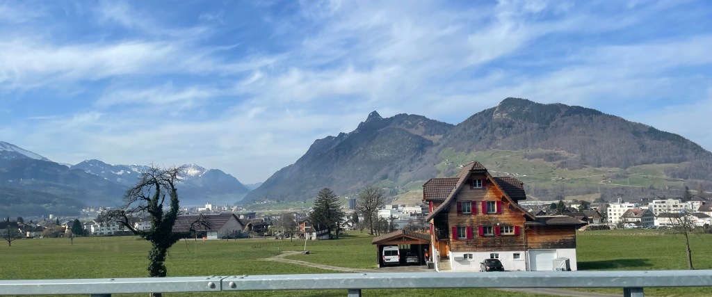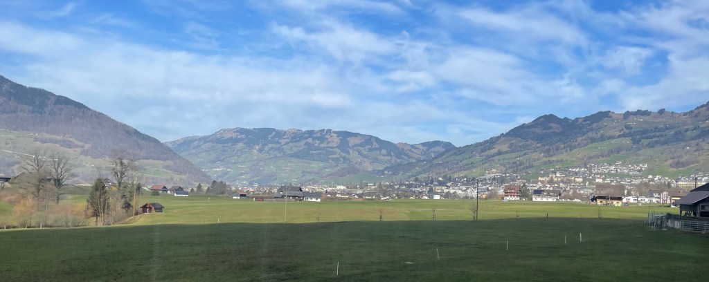 Wir steigen nicht aus, sondern fahren weiter, überblicken noch einmal die Ebene des Talkessels von Schwyz,
