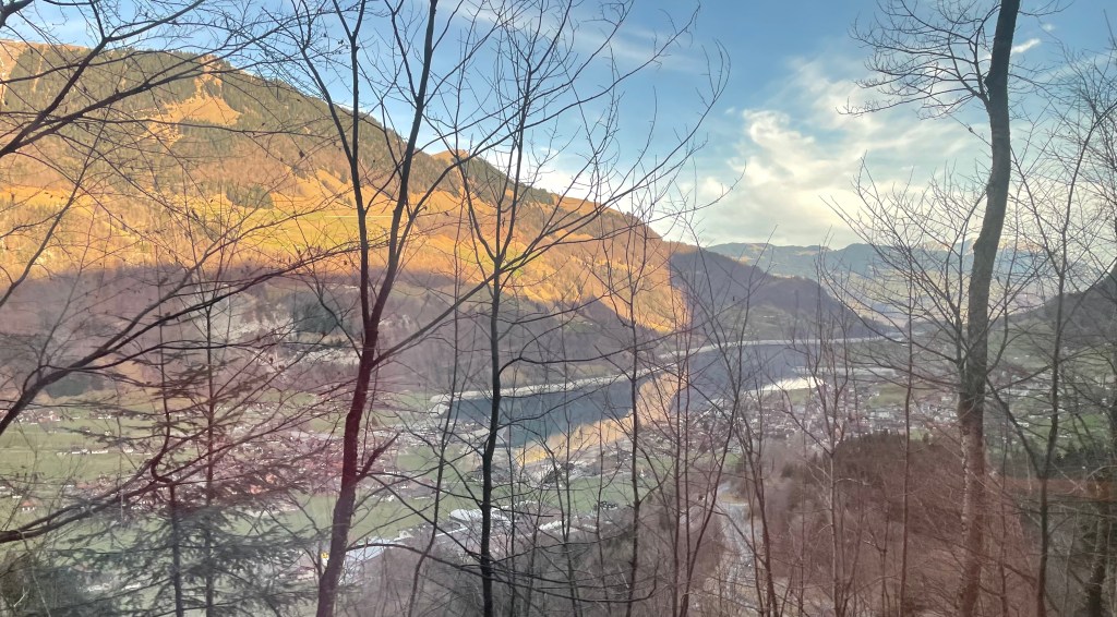 Ich mag nicht in Skispuren und auf vereisten Flächen ins Dorf laufen und womöglich wieder von einem Skifahrer der sein Gerät nicht beherrscht angefahren werden. Die Kniekehle schmerzt noch immer höllisch (am Abend sehe ich da wo mich der Wintersportler traf einen blutunterlaufenen blauen Flecken).